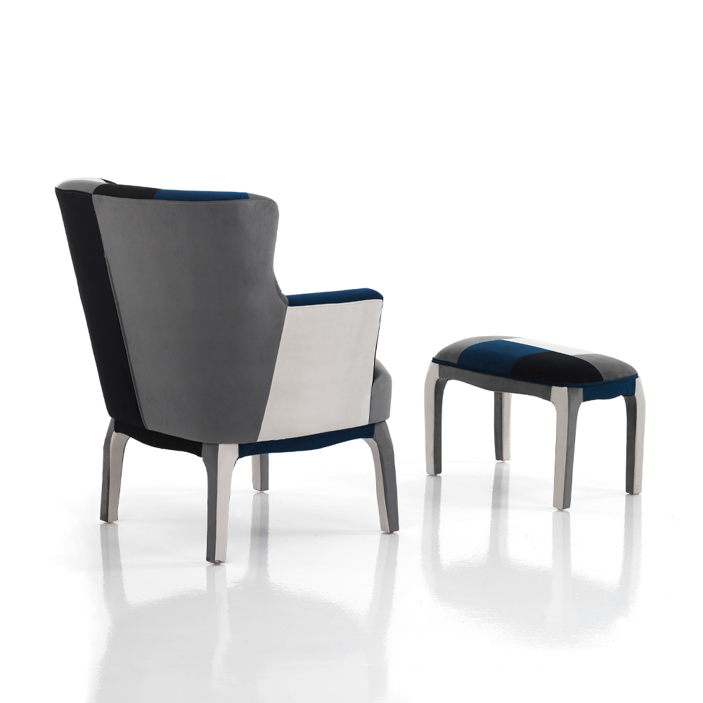 Armchair with pouf made with seat covered in fabric with non-removable patchwork technique and solid wood feet covered in fabric .