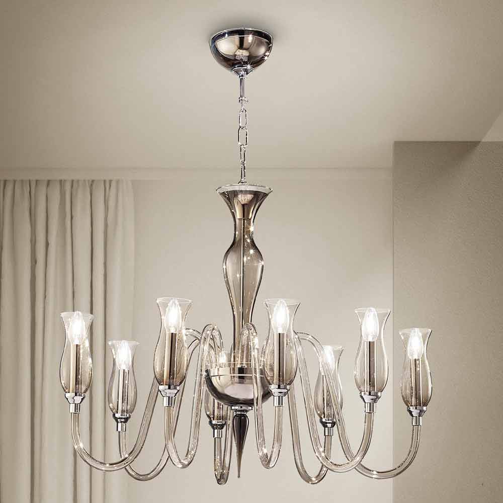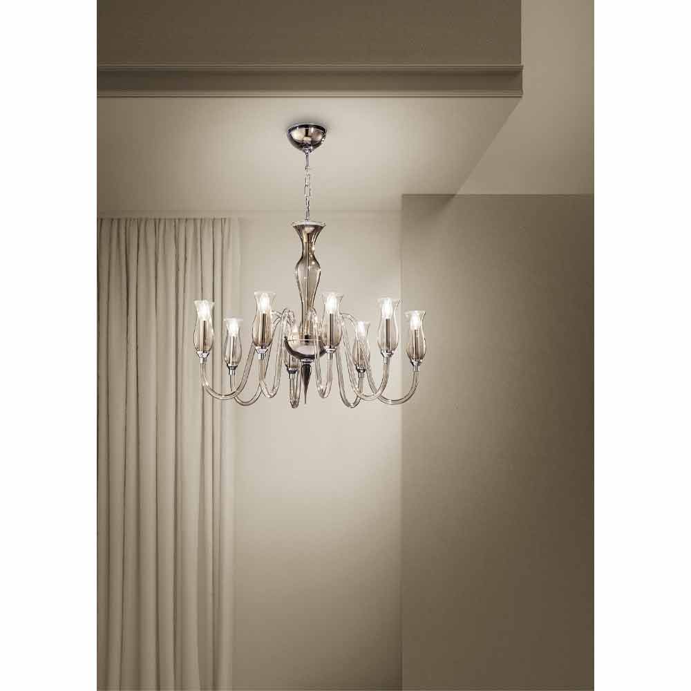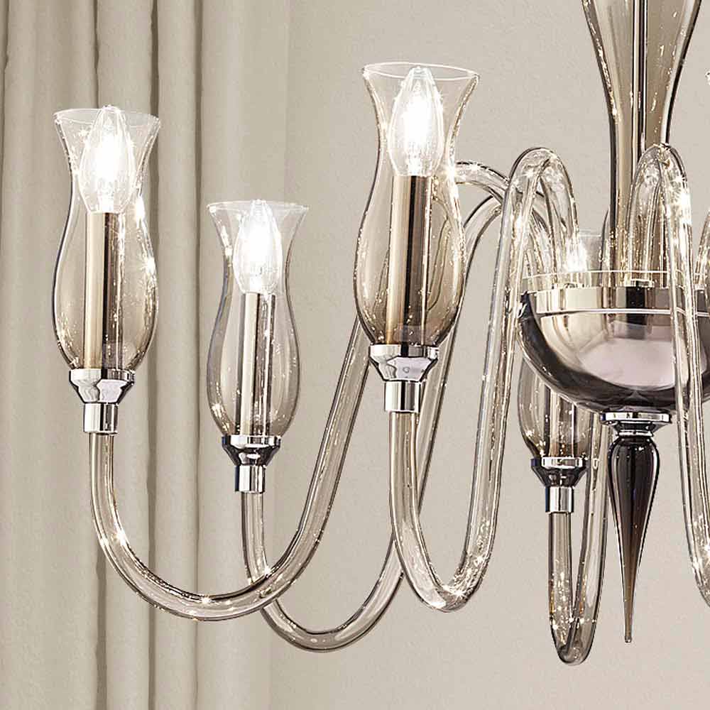 Refined 8-light chandelier in hand-crafted Venice glass in smoked finish with details in polished chromed metal , handcrafted in Italy. The majesty that underlines its shapes makes it the protagonist of the scene, ideal to be placed in the center of the room, in a living room or in a large classy bedroom for suggestive and romantic atmospheres. Its peculiarity is represented by the smooth surface of the glass that highlights the play of transparency and the wonderful vibrant effects of light for a result with a strong visual impact.
