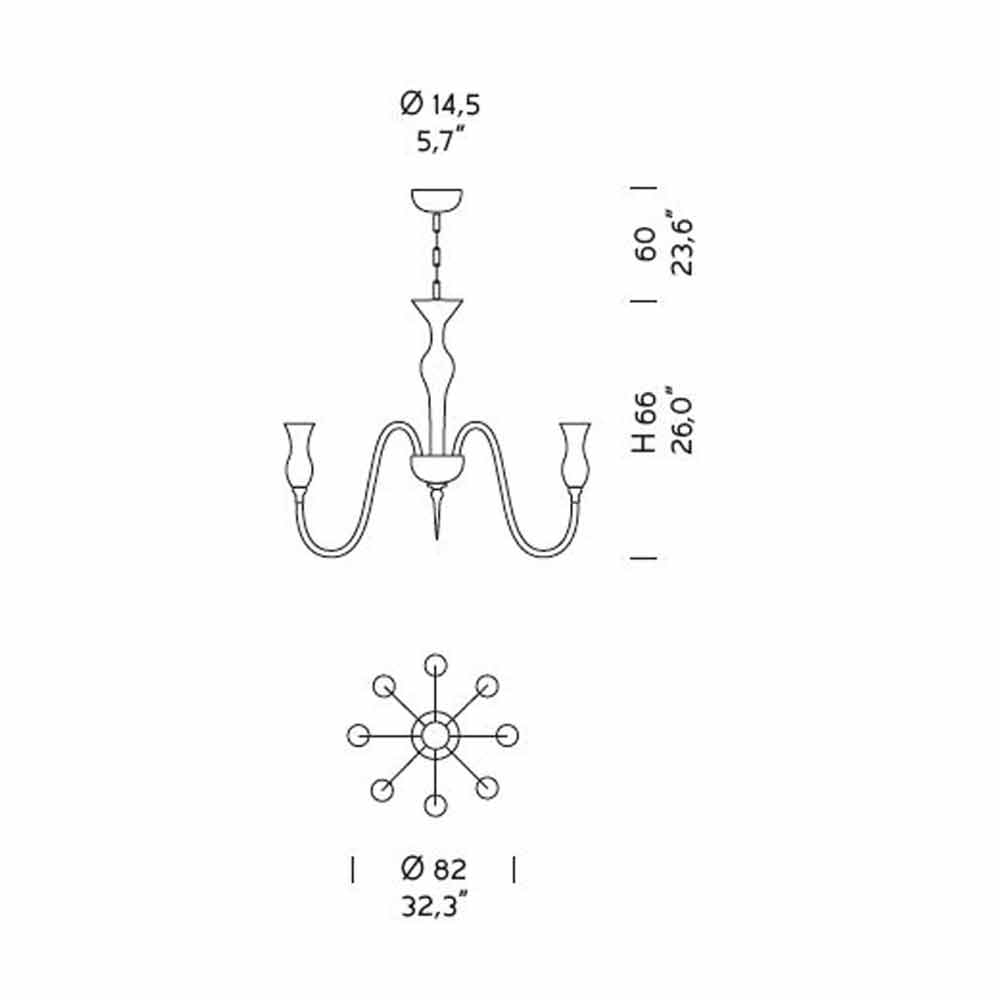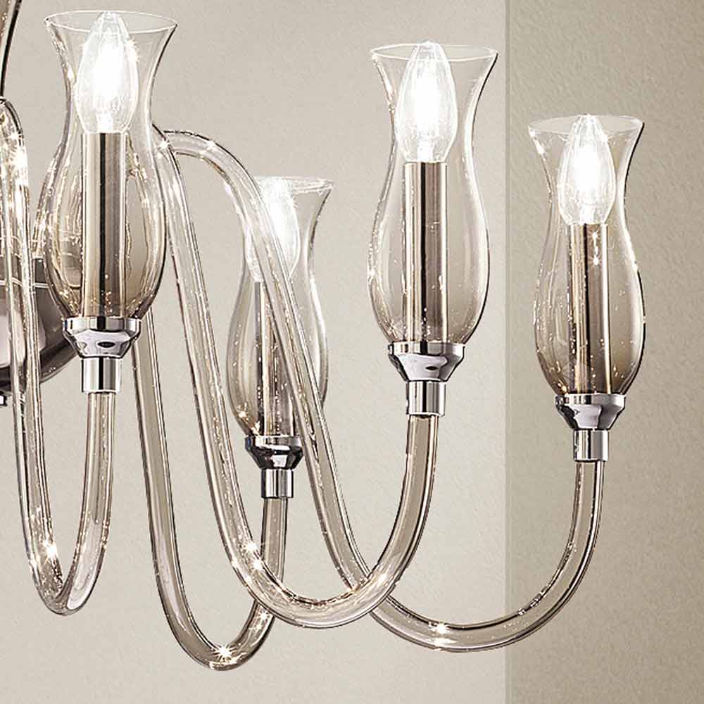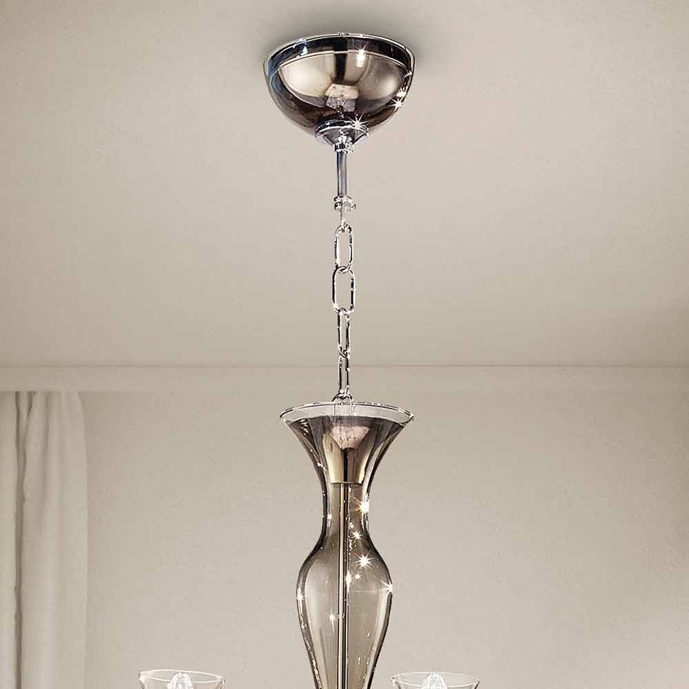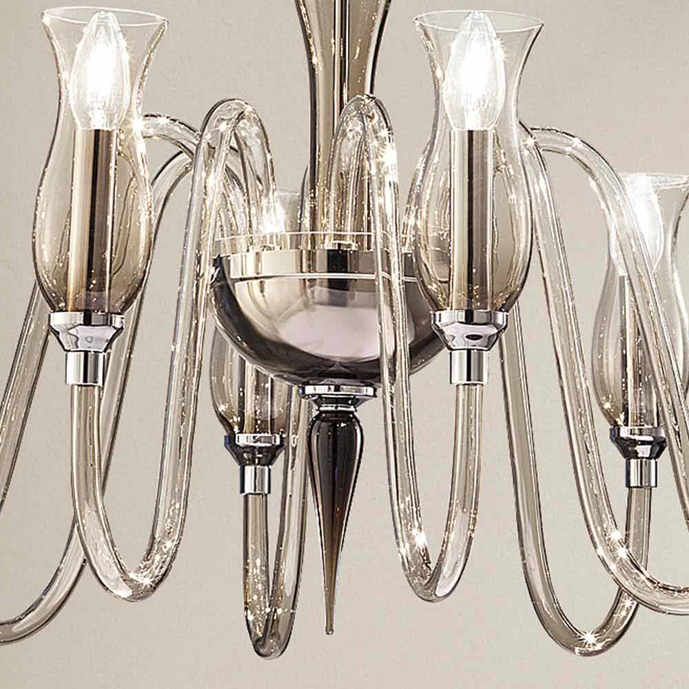 Refined 8-light chandelier in hand-crafted Venice glass in smoked finish with details in polished chromed metal , handcrafted in Italy. The majesty that underlines its shapes makes it the protagonist of the scene, ideal to be placed in the center of the room, in a living room or in a large classy bedroom for suggestive and romantic atmospheres. Its peculiarity is represented by the smooth surface of the glass that highlights the play of transparency and the wonderful vibrant effects of light for a result with a strong visual impact.