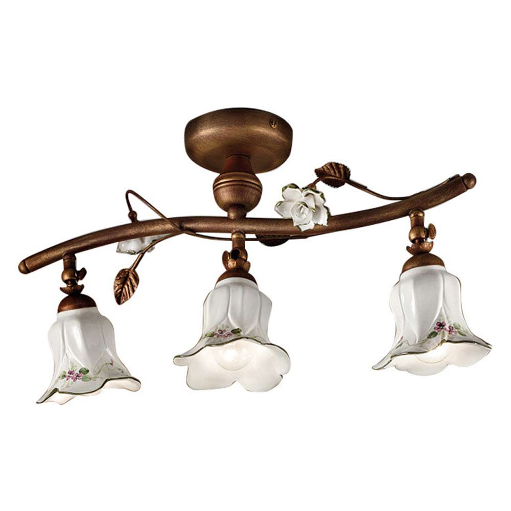 Linear ceiling lamp 3 lights in metal and ceramic with hand-painted roses made in Italy by Ferroluce.