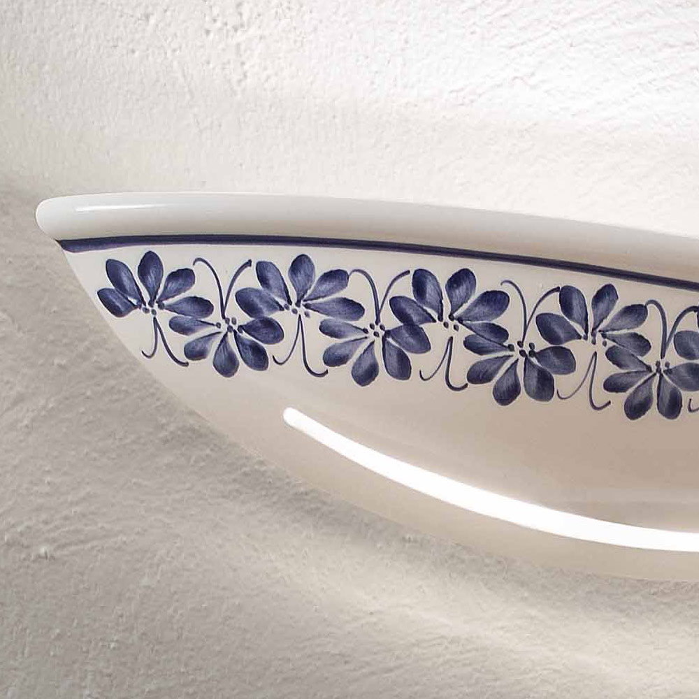 This crescent-shaped wall light is entirely made of ceramic with hand-painted blue thread decoration motifs, Ā to highlight the skill and manual skills of the artisans.