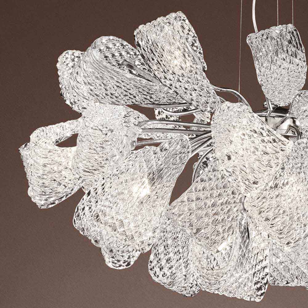 Imposing and refined 21-light chandelier handcrafted in Italy in crystal-finished Venice glass with details and inserts in polished chrome-finish metal . From the encounter between curved lines and voluminous shapes , an extremely refined lighting accessory is born, characterized by large glass bows that increase its value and enrich its aesthetics. On them we find a diamond pattern obtained by imprinting the texture on the glass while hot and thus allowing the light to slide between the grooves, mirroring itself on the metal elements for a spectacular play of reflections .