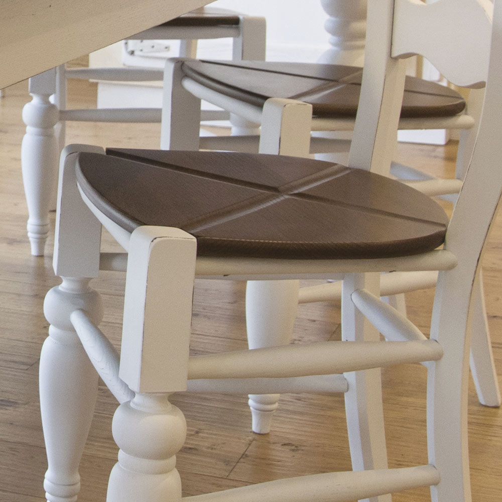 The 4 chairs included have a "worn effect" hawthorn-colored ash wood structure and a hearth-colored wooden seat.