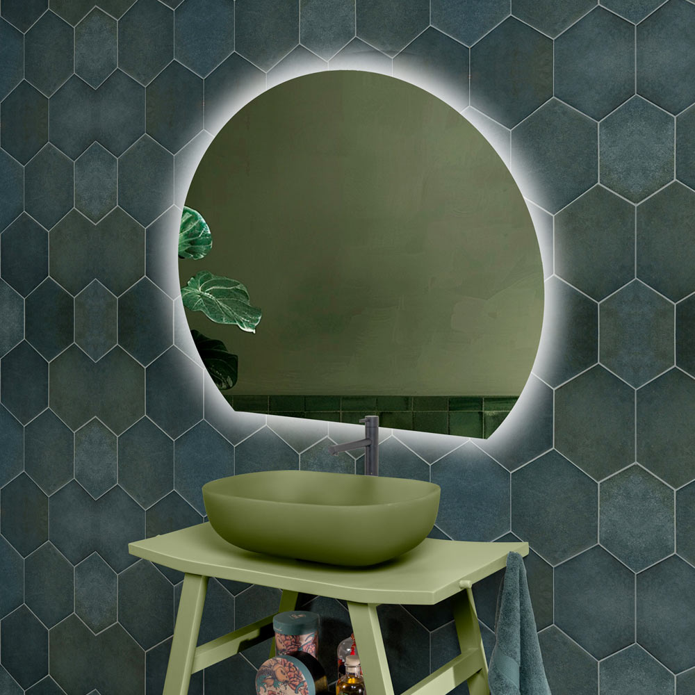 The integrated LED light , evenly distributed along the perimeter, creates a soft effect that enhances the purity of the circular shape and contributes to a welcoming and refined atmosphere. Perfect for personal care, it provides functional yet evocative lighting.