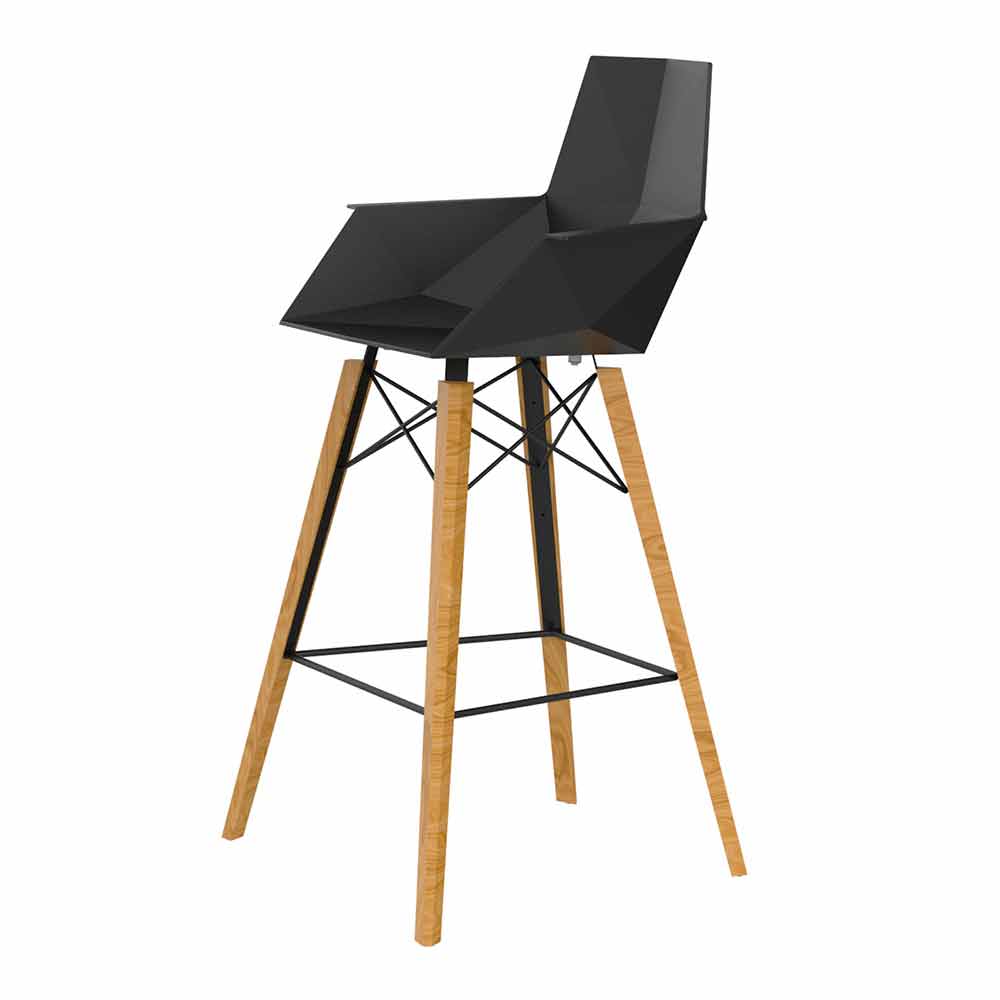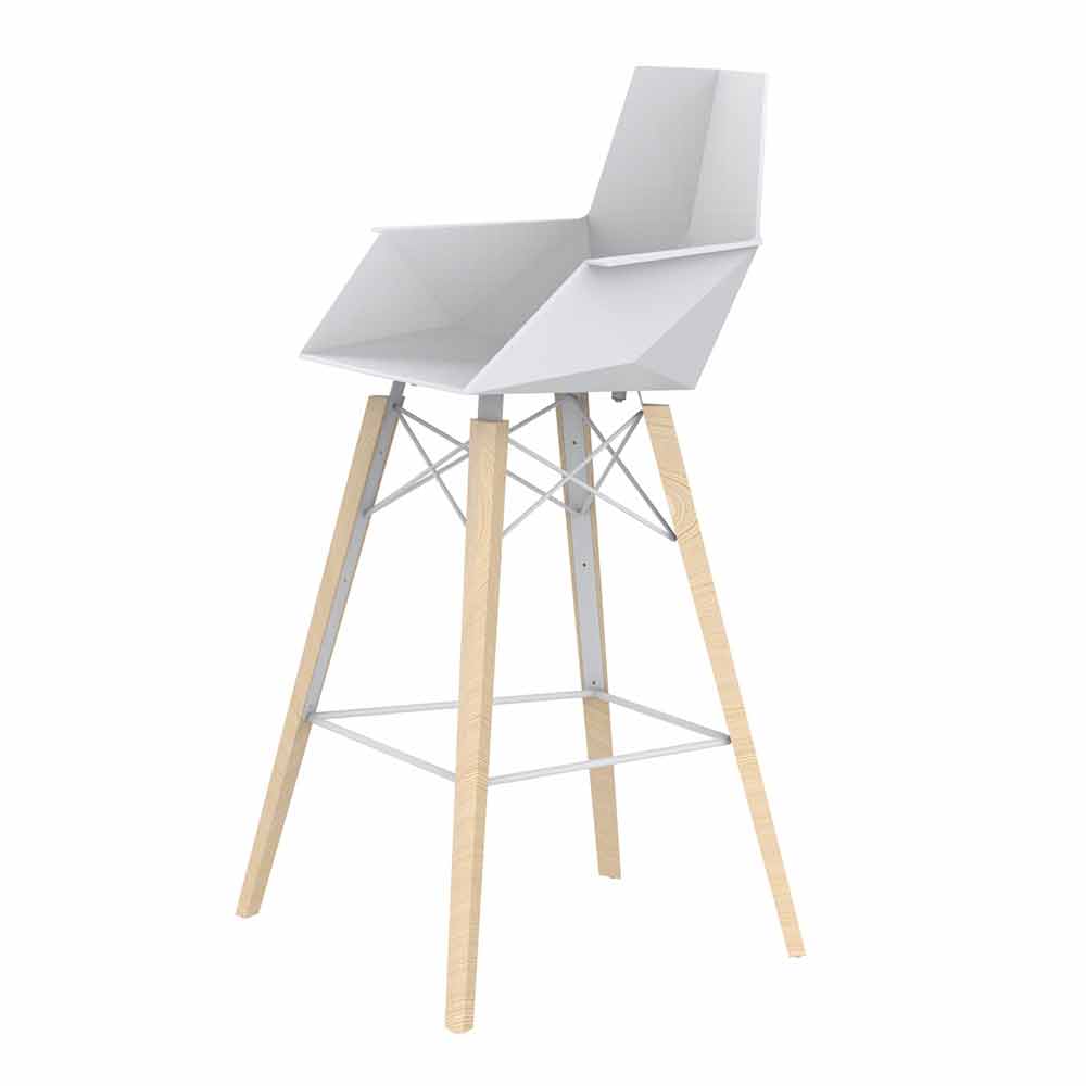 Bar stool with structure in ash wood and seat and backrest and armrests in polypropylene in various colors.