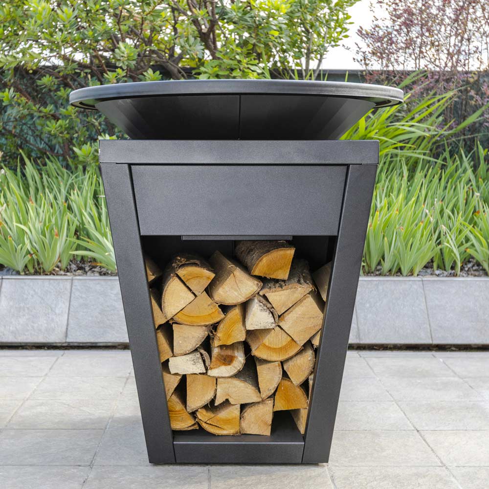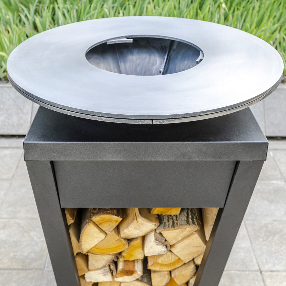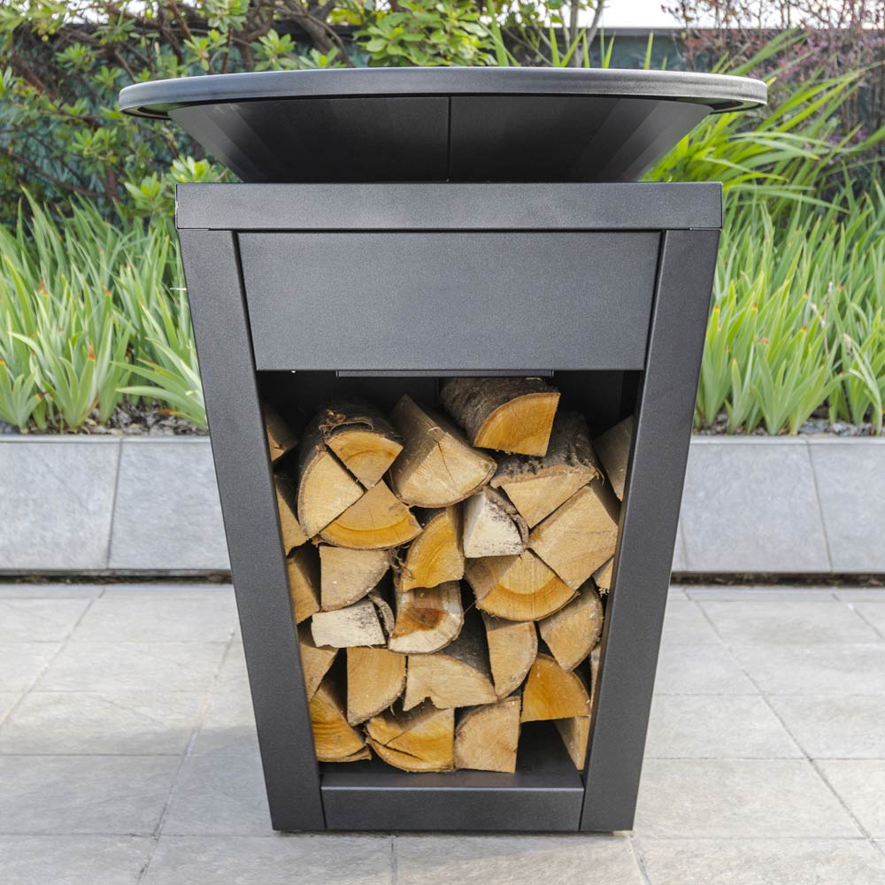 Outdoor wood burning barbecue of design multi-equipped: wood compartment, cooking plate, ash compartment and vent.