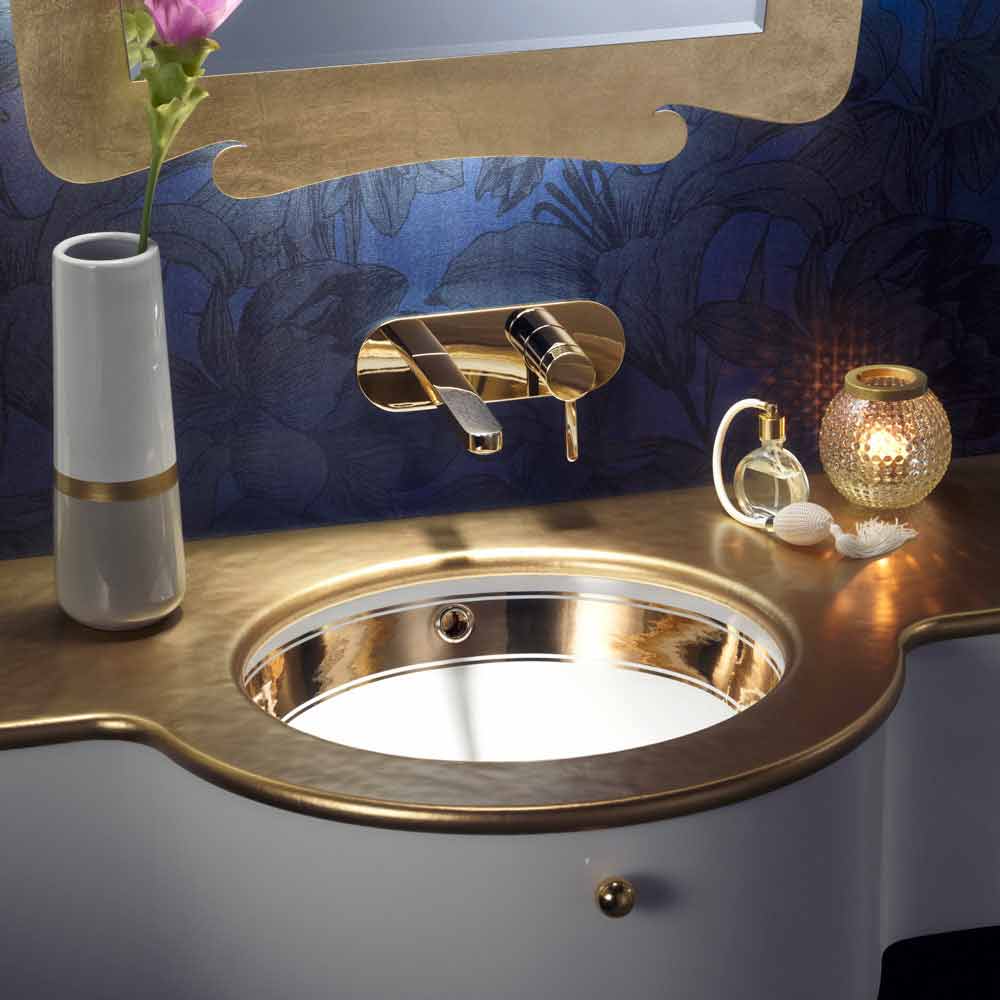 Undercounter bathroom sink produced in Italy in handmade fire clay with 24 carat gold band and fillets.