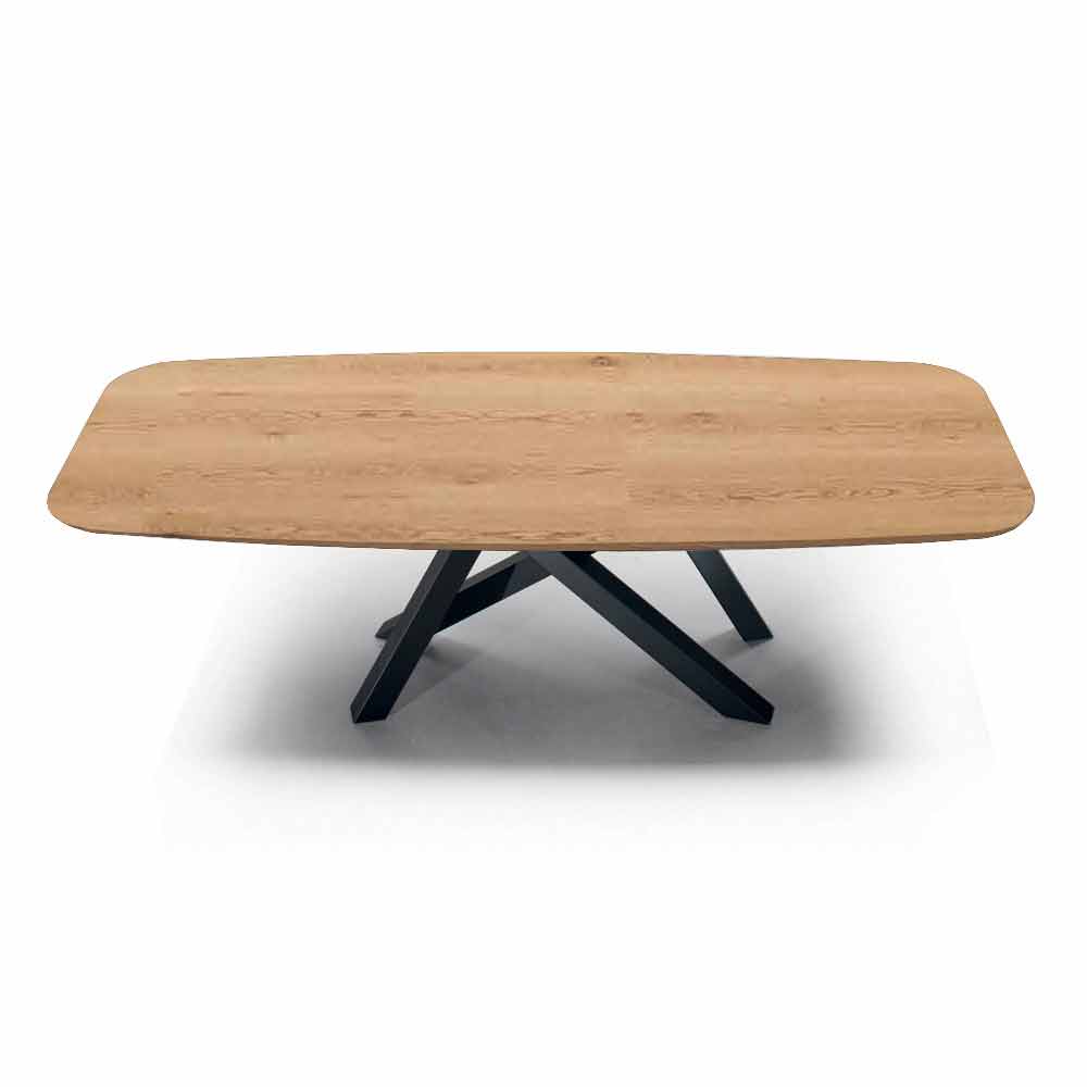Dining table made in Italy with barrel-shaped top in veneered wood and base in black lacquered steel . Ideal for enriching your spaces with style and personality , this piece of furniture brings with it its elegant soul underlined by the simple and minimal lines that blend perfectly with the proposed finishes, which refine the shape of the table offering an idea of exclusive and refined furnishings. What enriches its aesthetics giving it uniqueness is the particular shape of the base which uses simple geometric shapes intertwined with each other to give life to a result with a strong contemporary personality capable of completing any dining room or kitchen with a modern taste with character, bringing with it a wonderful elegance conferred by the wood grains that cover the entire table top.