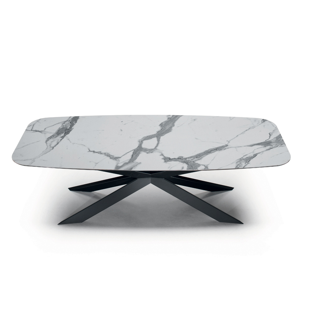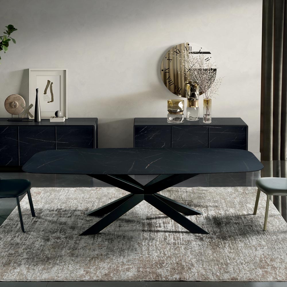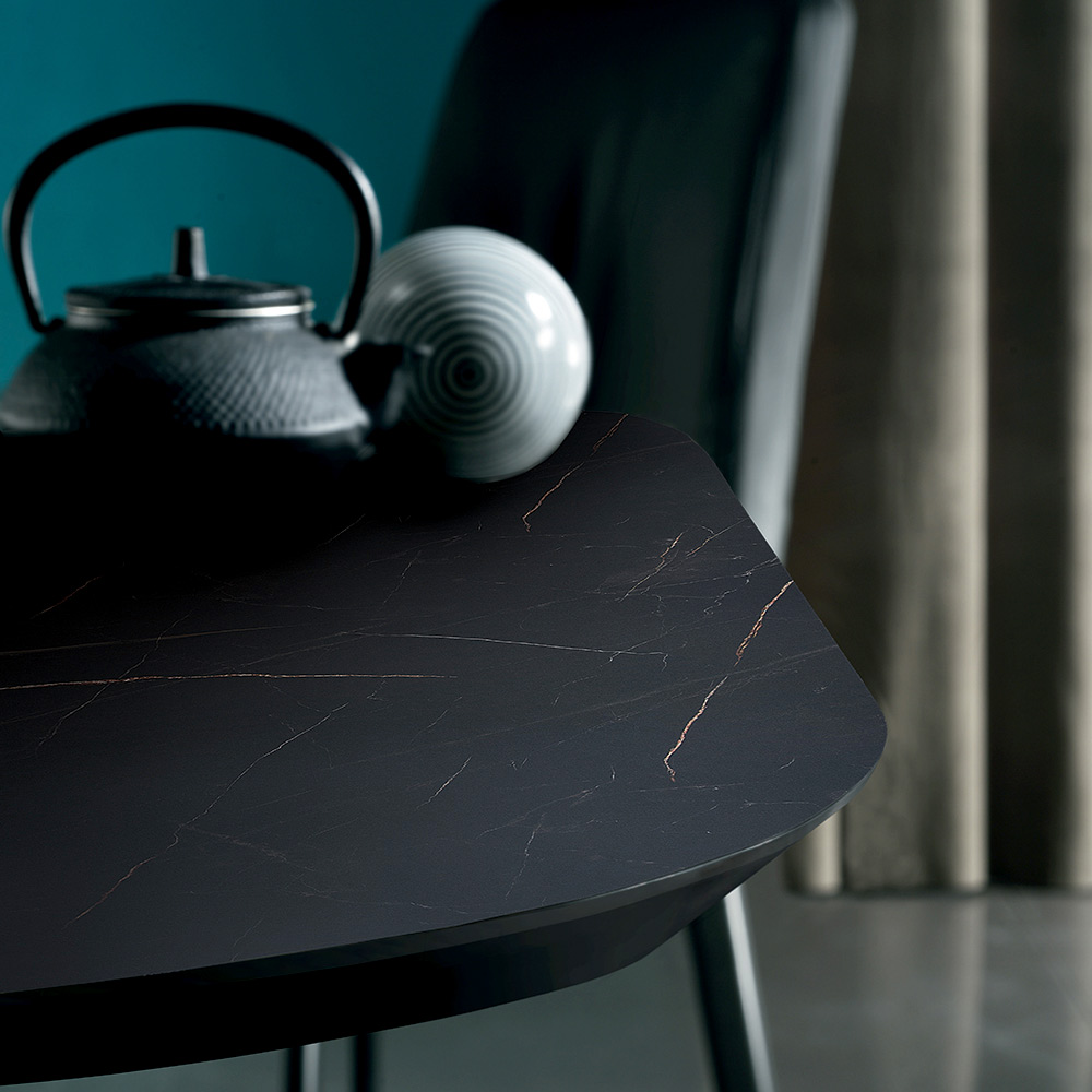 contemporary design in style. The splendid combination of chosen materials and the particular barrel shape of the top represent the key elements that enrich the aesthetics of the table, raising its quality for a