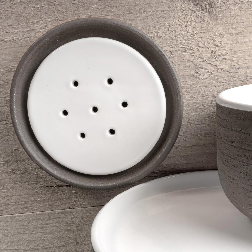 Countertop bathroom accessories in clay with white enameled interior Made in Italy.