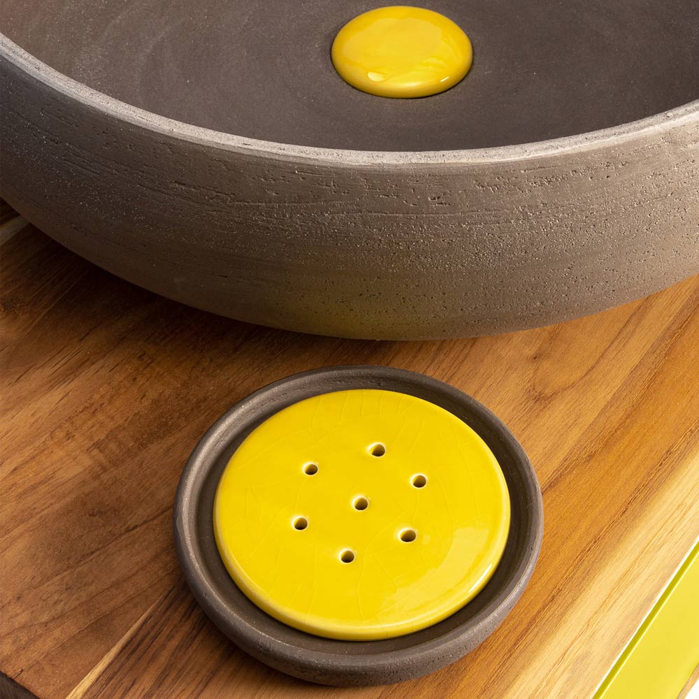 Bathroom accessories in refractory clay with enameled details Made in Italy.