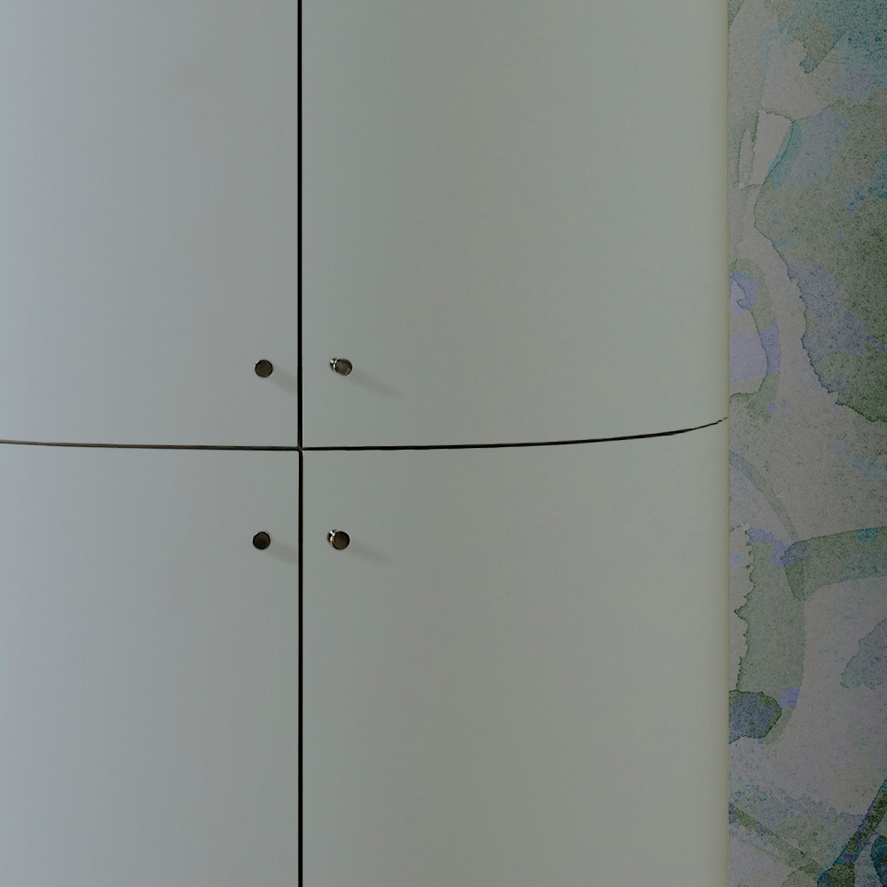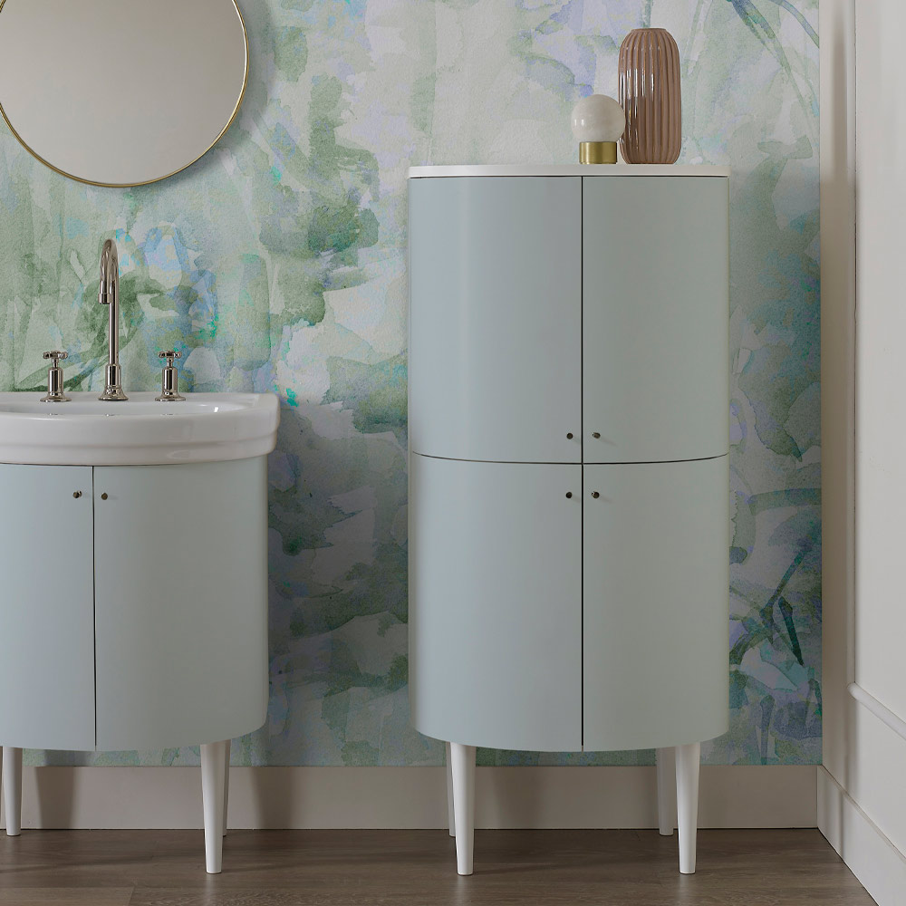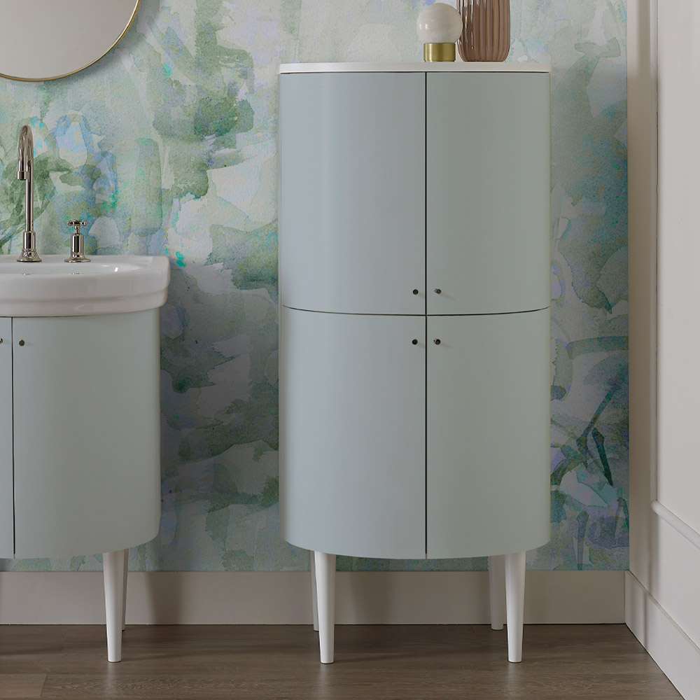 MDF column with four doors   light blue matt finish   which close off three shelves, two of which in glass and one   in Hydro MDF. The top shelf and the legs are in a matt white finish and the knobs are included in a nickel finish.