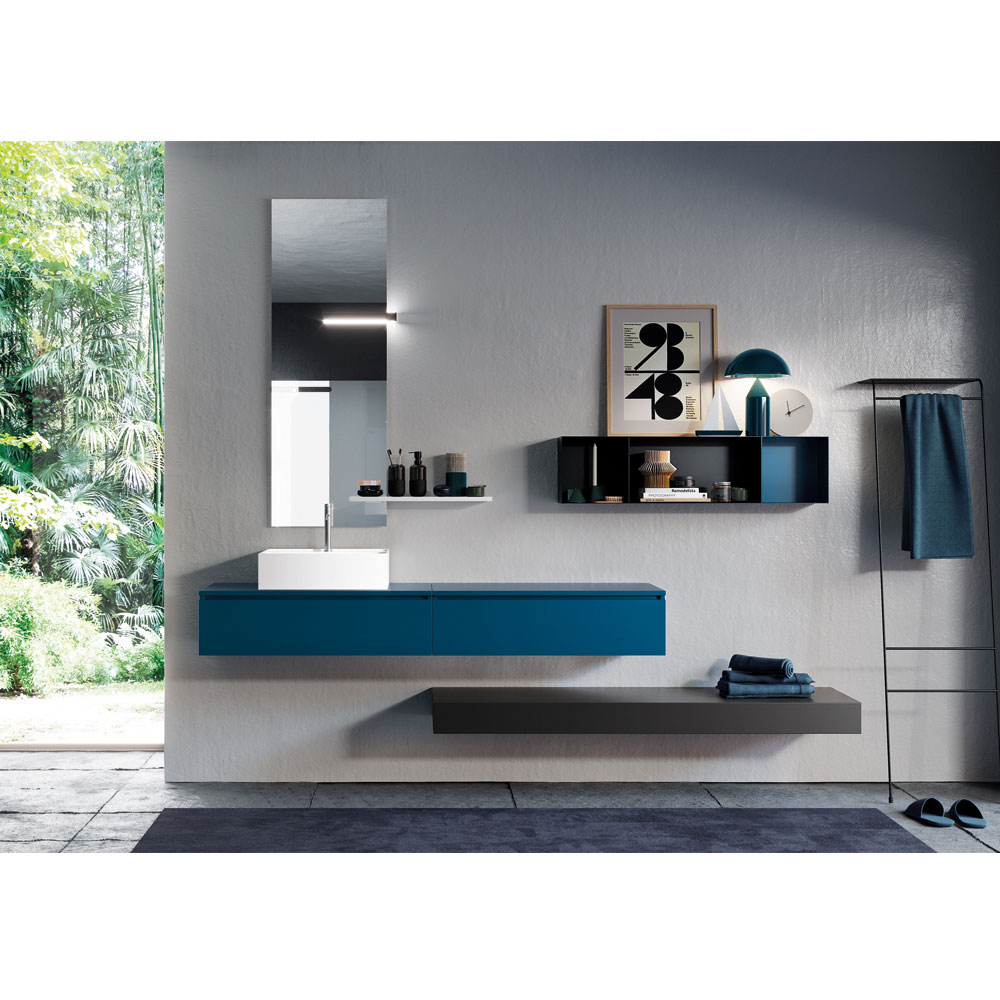 Bathroom composition composed of a modern style rectangular mirror with lamp, a glossy white ceramic washbasin resting on a light blue scratch-resistant melamine base with 2 fully opening drawers with soft close closure and an anthracite-coloured coated MDF and HPL shelf.