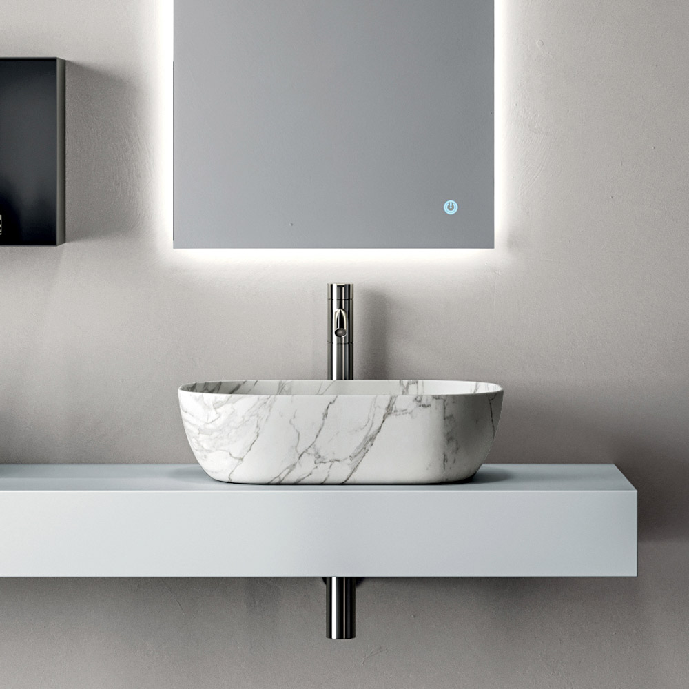 The Calacatta-finish ceramic sink adds a sophisticated touch: the marble-inspired surface enhances the brightness of the white and lends prestige to the sink area.
