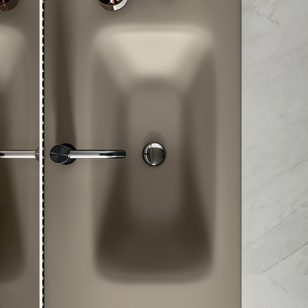 The satin glass sink in dove grey creates a refined tone-on-tone interplay with the base, enhancing the visual lightness of the entire composition and giving brightness to the sink area.