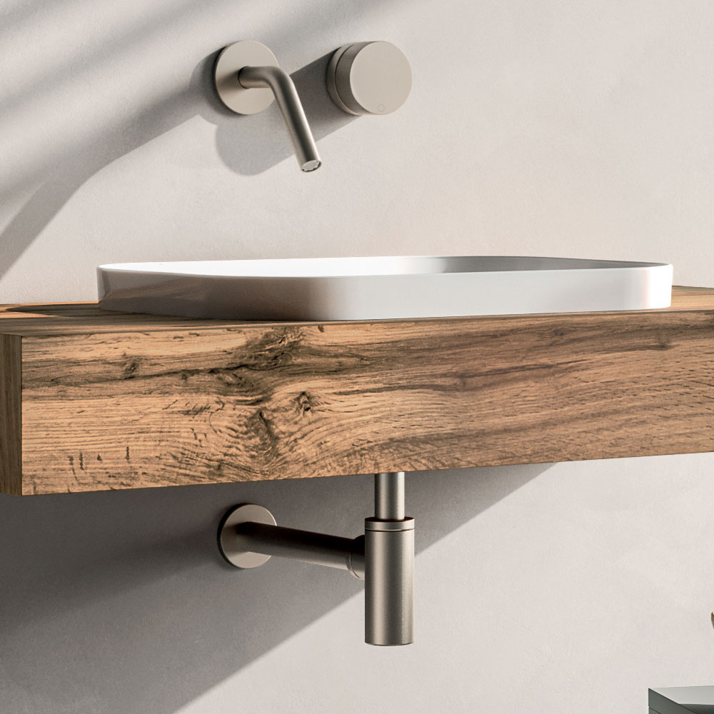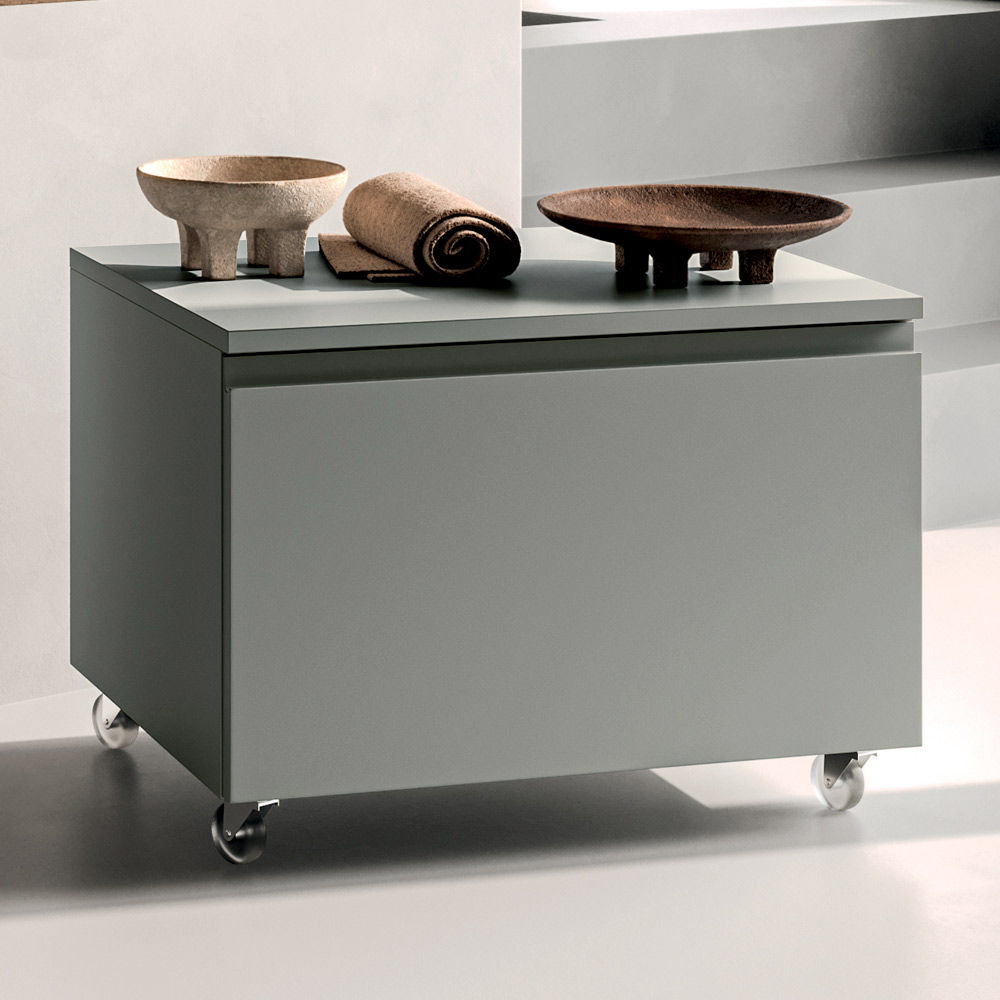 The base unit with drawer provides practical and well-organized storage, ideal for keeping your space tidy without sacrificing aesthetics. The matte gray finish lends a textured, contemporary look that easily complements a variety of decor styles. Making the composition even more versatile, the caster wheels allow for flexible space management, ideal for modern bathrooms, contract projects, or unconventional furnishing solutions.