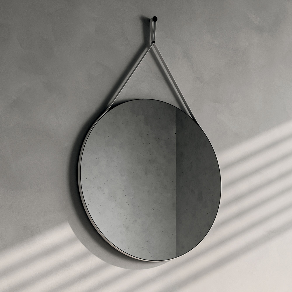 The round mirror completes the ensemble with a discreet and refined decorative touch, helping to visually enlarge the space and create a bright and welcoming atmosphere.
