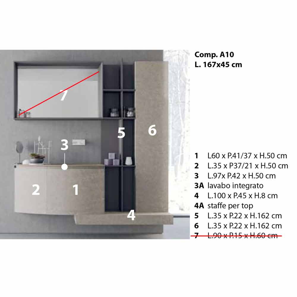 Volumetric and modern bathroom composition, suspended design with integrated washbasin, made in Italy.