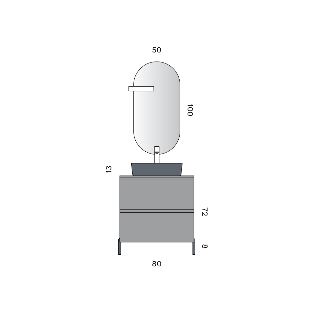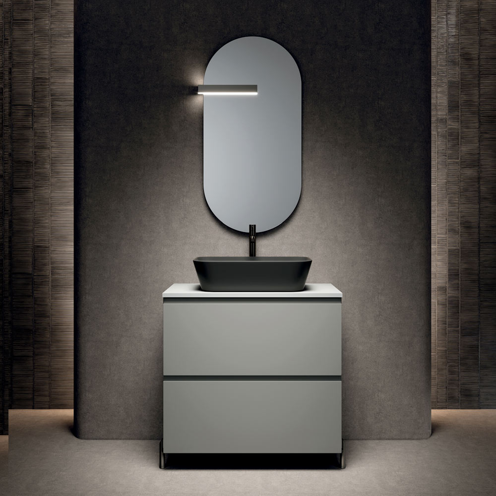 Bathroom cabinet with matt grey legs, anthracite washbasin and shaped mirror