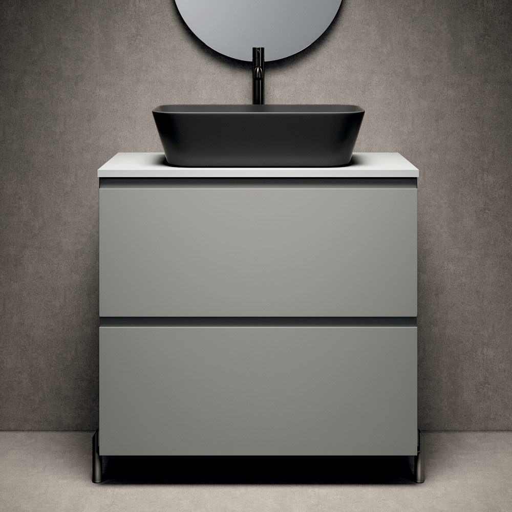 A solution designed for those who want a modern bathroom cabinet with legs , characterised by trendy matt finishes and anthracite details with a strong aesthetic impact.