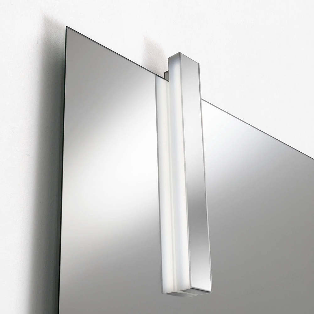 The 50x100 cm shaped mirror adds verticality and personality to the room, while the chrome LED lamp ensures functional and diffused lighting, perfect for the sink area.