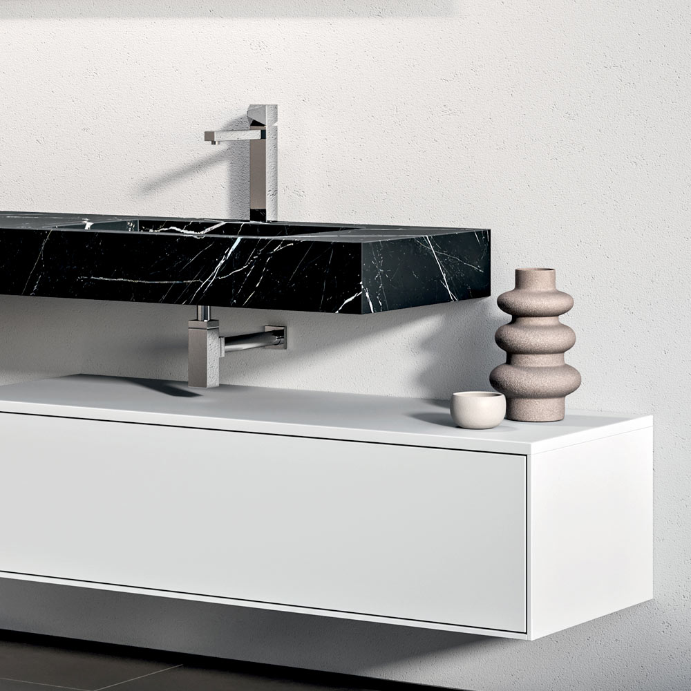The suspended design highlights the lightness of the shapes and enhances the architecture of the space, while the spacious drawer ensures functionality and everyday organization. The clean surfaces and essential lines define a modern, minimalist style with a strong impact.