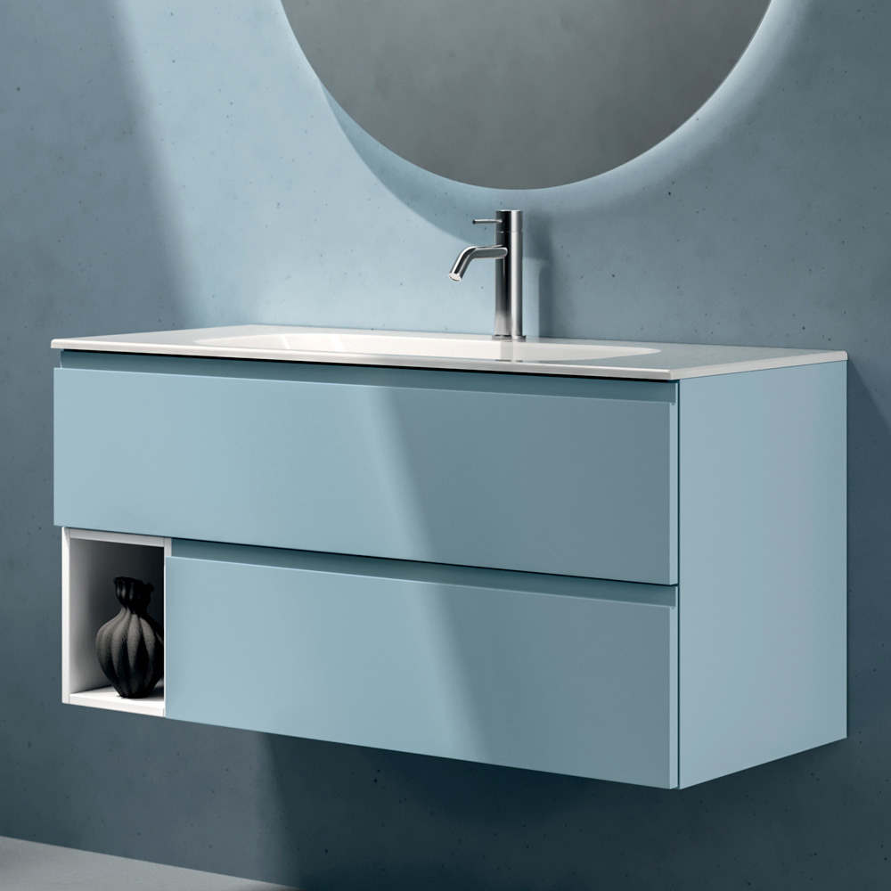 The wall-mounted base units with Tiffany-finish drawers , one with a siphon attachment, ensure functional storage space management while maintaining a clean, essential aesthetic. The matte surfaces enhance the linear design and contribute to an elegant, harmonious result.