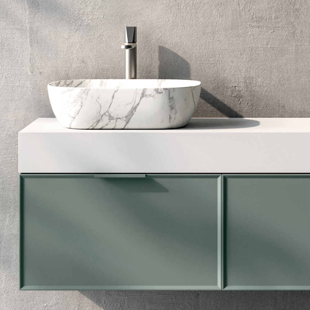 Wall-hung bathroom cabinet with double sage drawer, Calacatta sink and backlit mirror