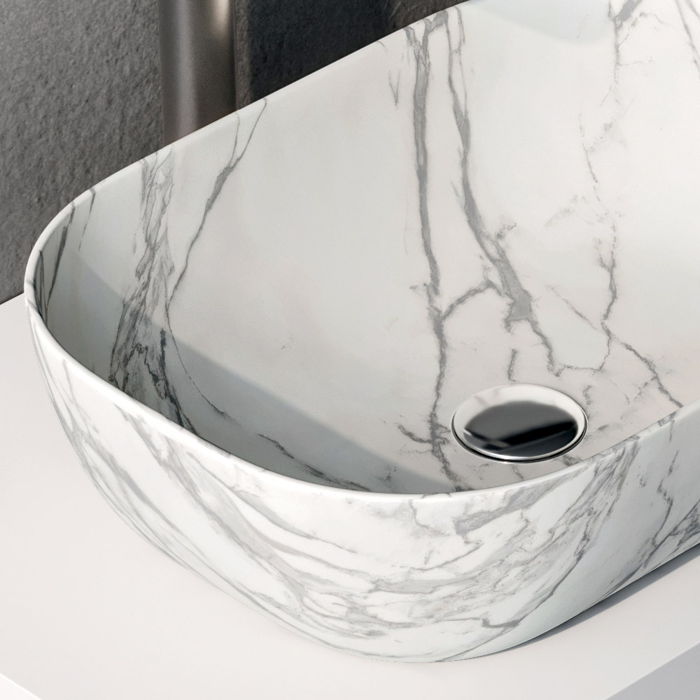 The matt white washbasin top harmoniously accompanies the Calacatta-effect ceramic washbasin , characterised by a luminous surface and delicate veining reminiscent of marble, enhancing the entire composition.