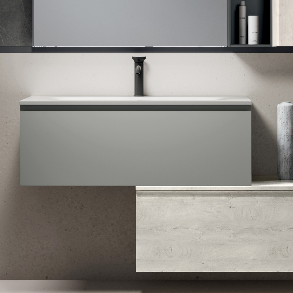 The suspended base units with basket , in the refined matt grey and Alaska oak finishes, offer ample storage capacity and help keep the room tidy and visually light.