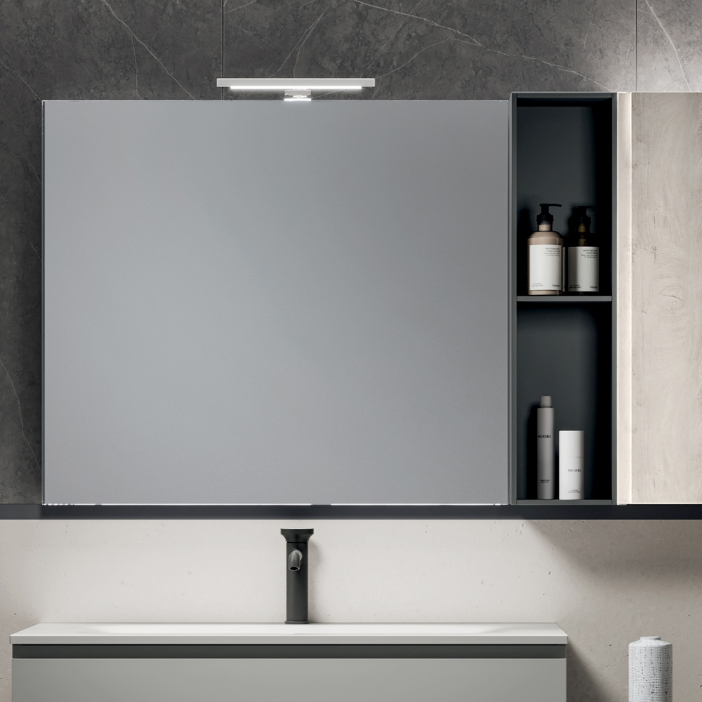 The rectangular mirror and chrome LED lamp enhance the whole with balanced and refined lighting, designed to highlight the materials, finishes and depth of the space.