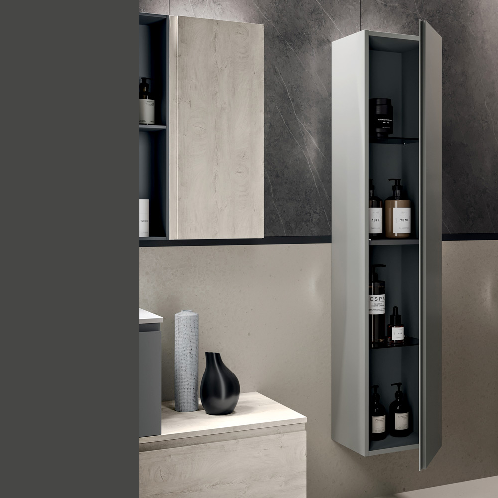 The suspended wall unit in Alaskan oak finish and the anthracite open element enrich the structure with functional and decorative solutions, ideal for organizing and personalising the bathroom space with elegance and practicality.