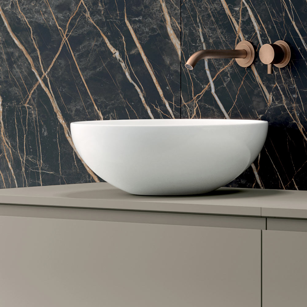 The two glossy white ceramic countertop sinks , with their simple and harmonious shapes, ensure everyday comfort and easy cleaning, while also offering a strong aesthetic. The double sink configuration makes the composition ideal for master bathrooms or shared spaces.