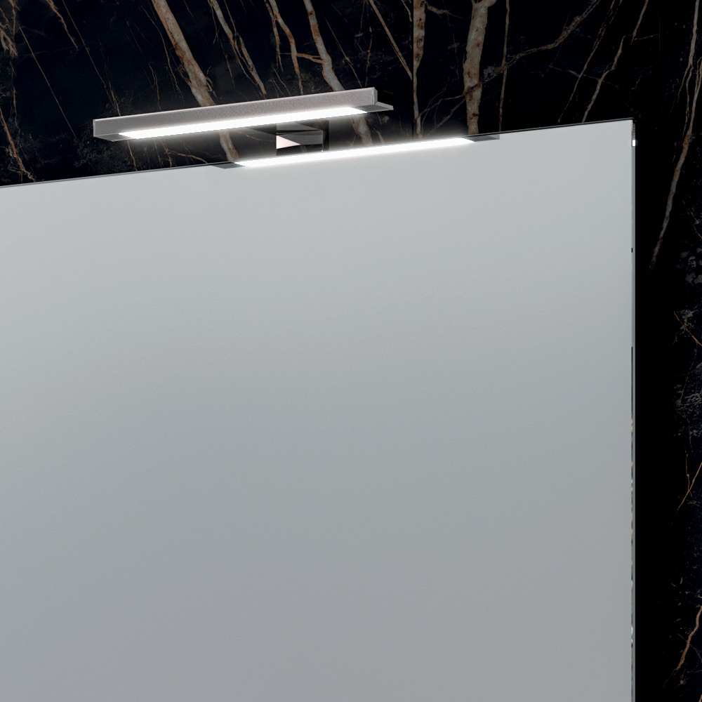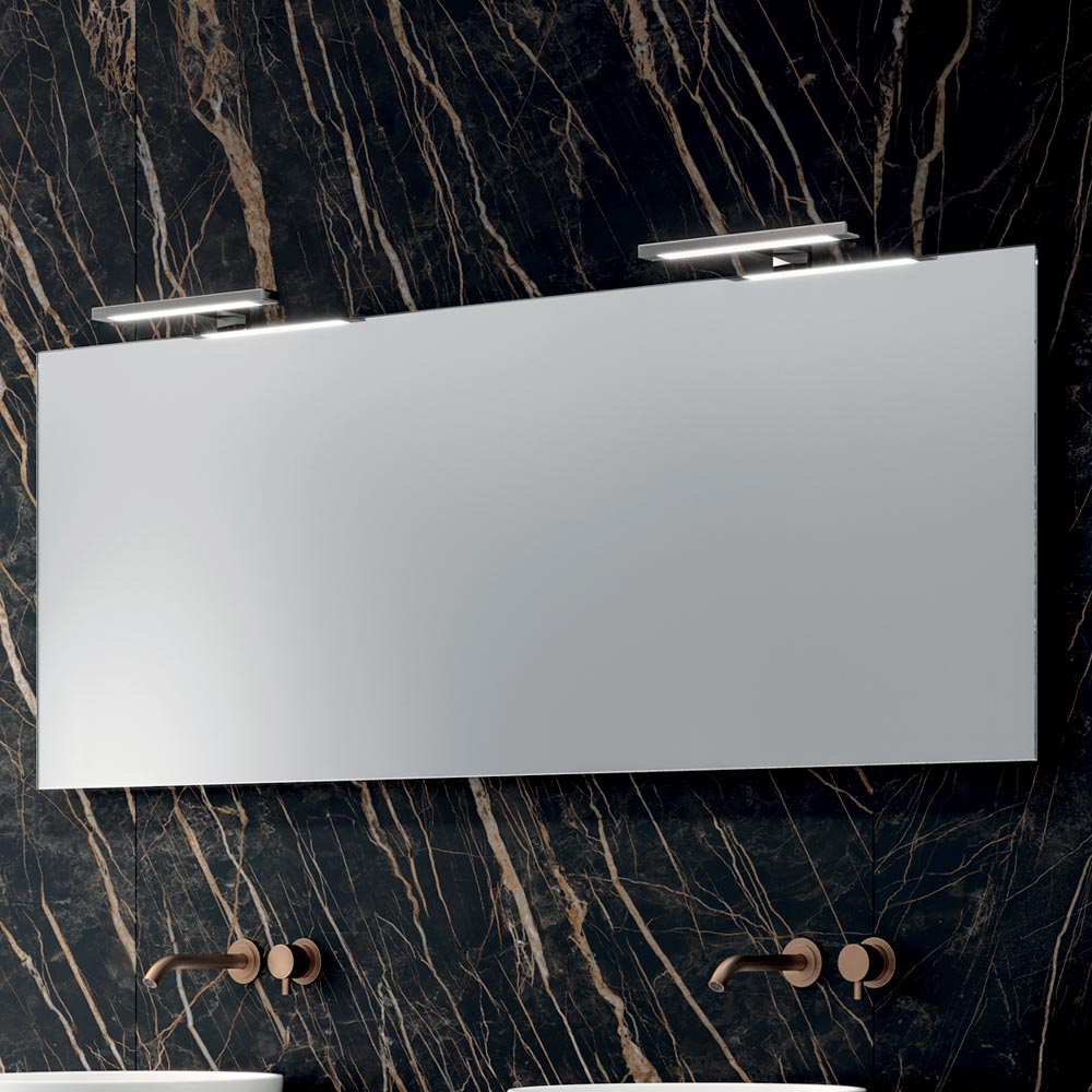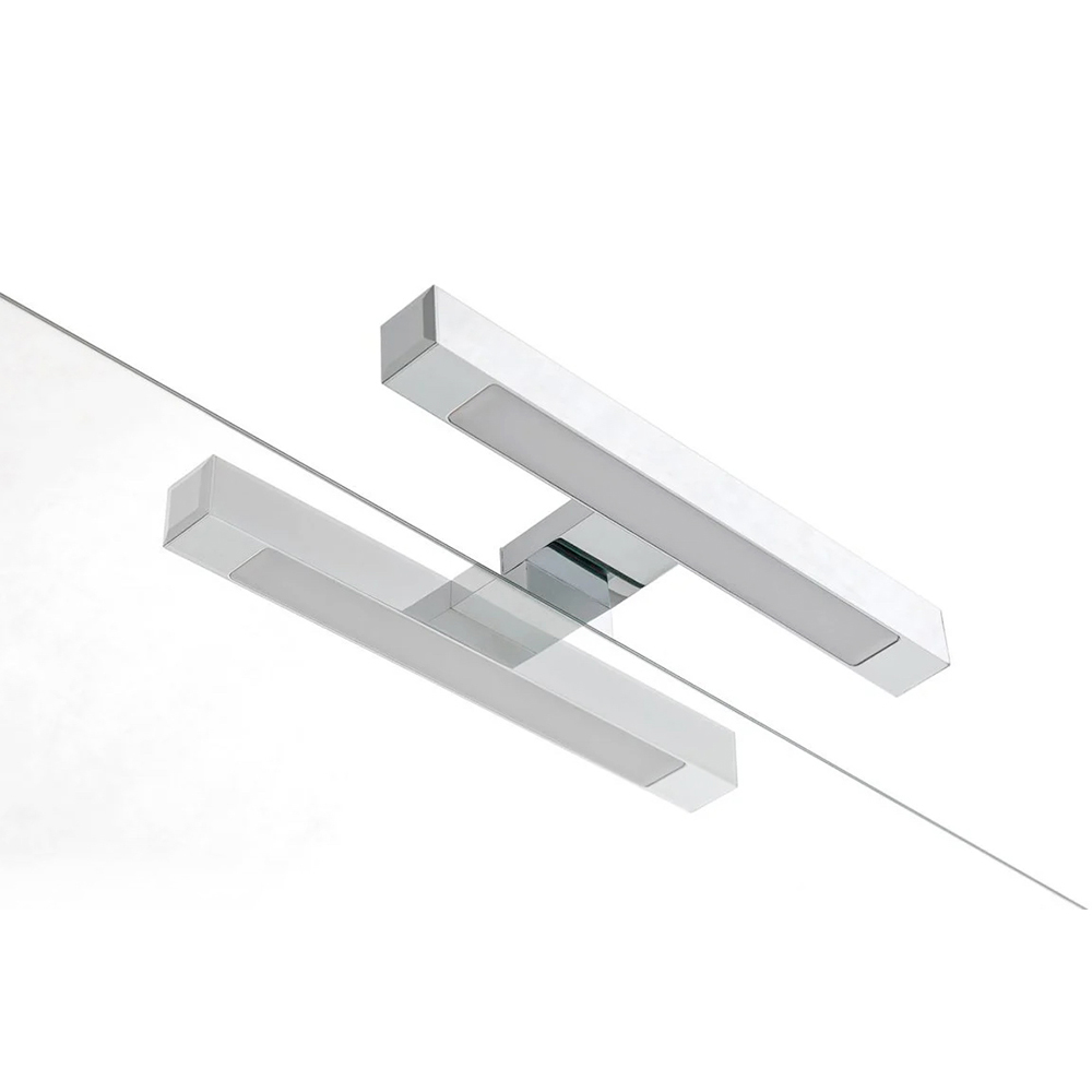 The rectangular mirror amplifies the brightness and gives depth to the space, while the chrome-finished LED lamps add elegant and functional lighting, perfect for enhancing the sink area.