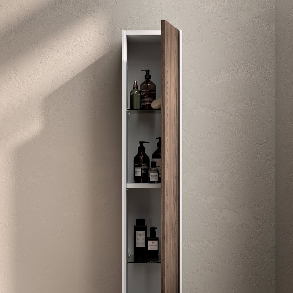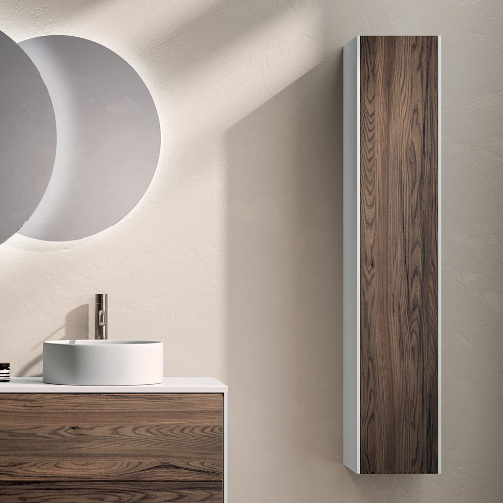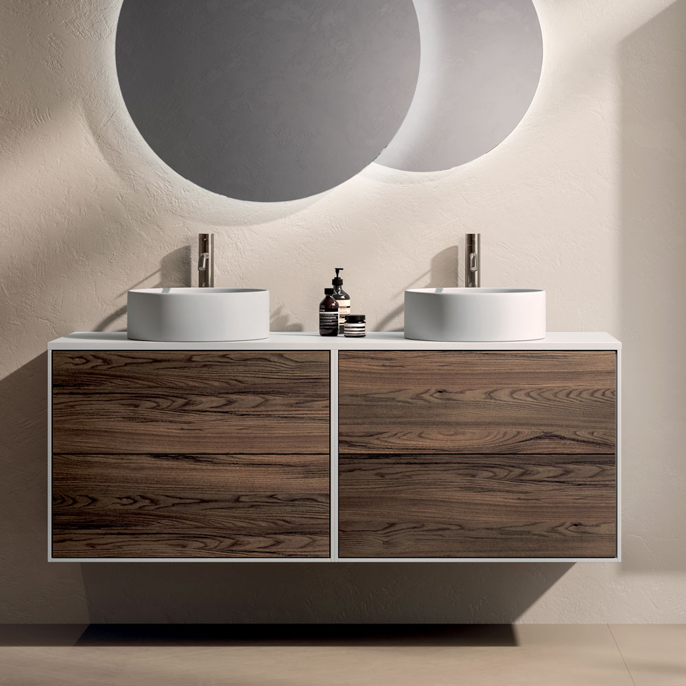 A bathroom composition with a strong visual impact, characterised by the material warmth of Rio oak and the purity of the matt white top , which together create a refined balance between naturalness and contemporary minimalism.