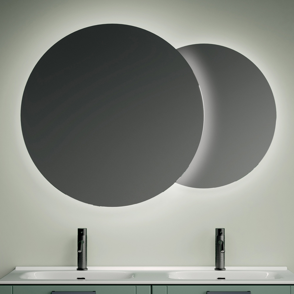 The backlit round mirrors complete the composition with a suggestive lighting effect, amplifying the perception of space and creating an enveloping and contemporary atmosphere.