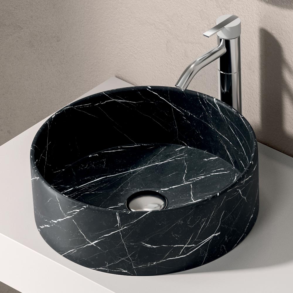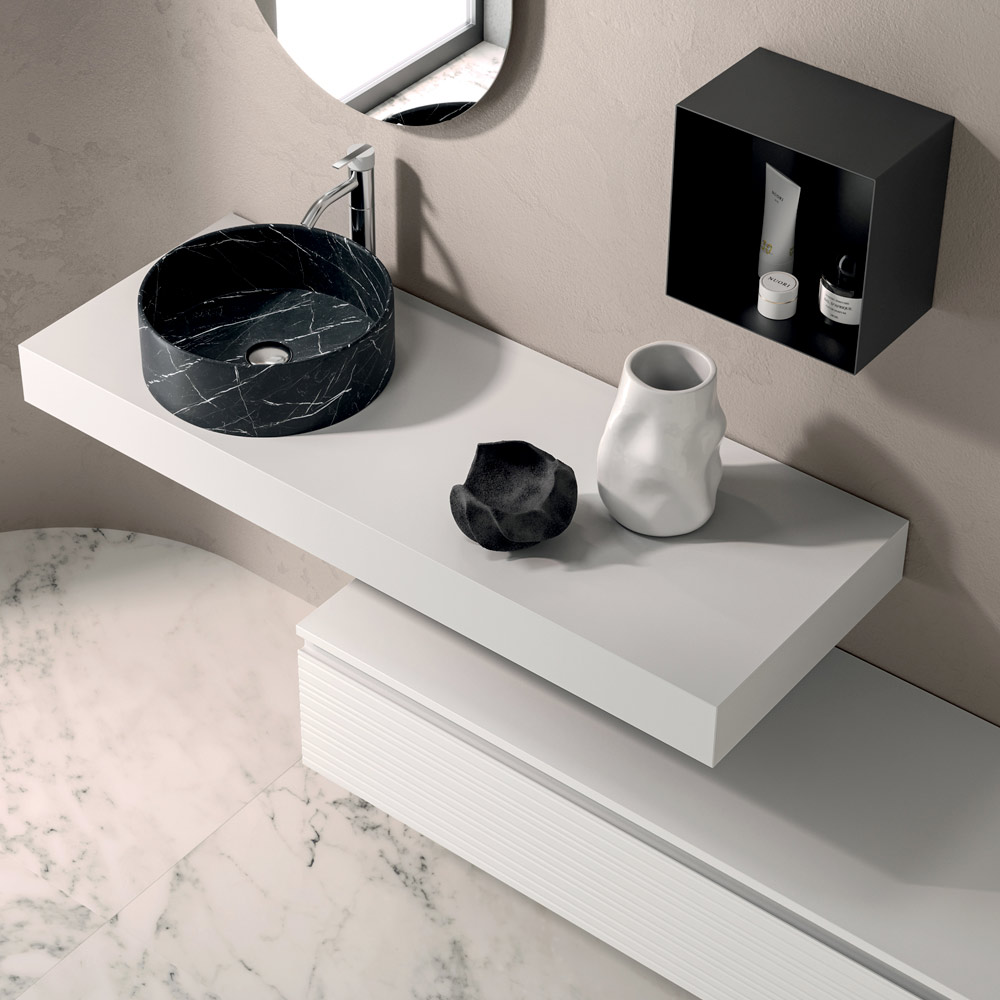 The Marquina-effect ceramic washbasin , with soft lines and a strong material impact, introduces an elegant chromatic contrast that embellishes the whole and underlines its sophisticated character.