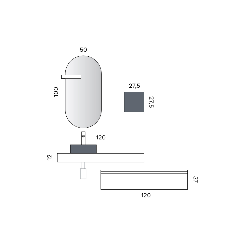 • Base with drawer: length 120 cm x depth 45 cm x height 35 cm