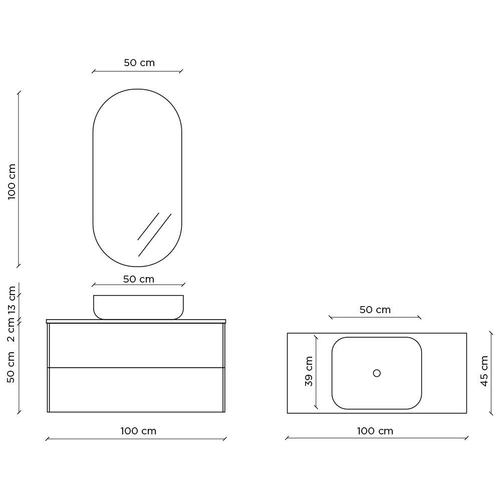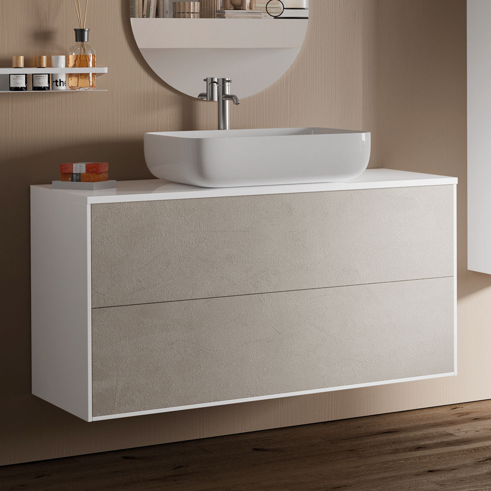 Bathroom composition with base Ā in scratch-resistant melamine with 2 fully extractable drawers and soft close closure in Havana stone color , oval mirror and console sink in glossy white ceramic .