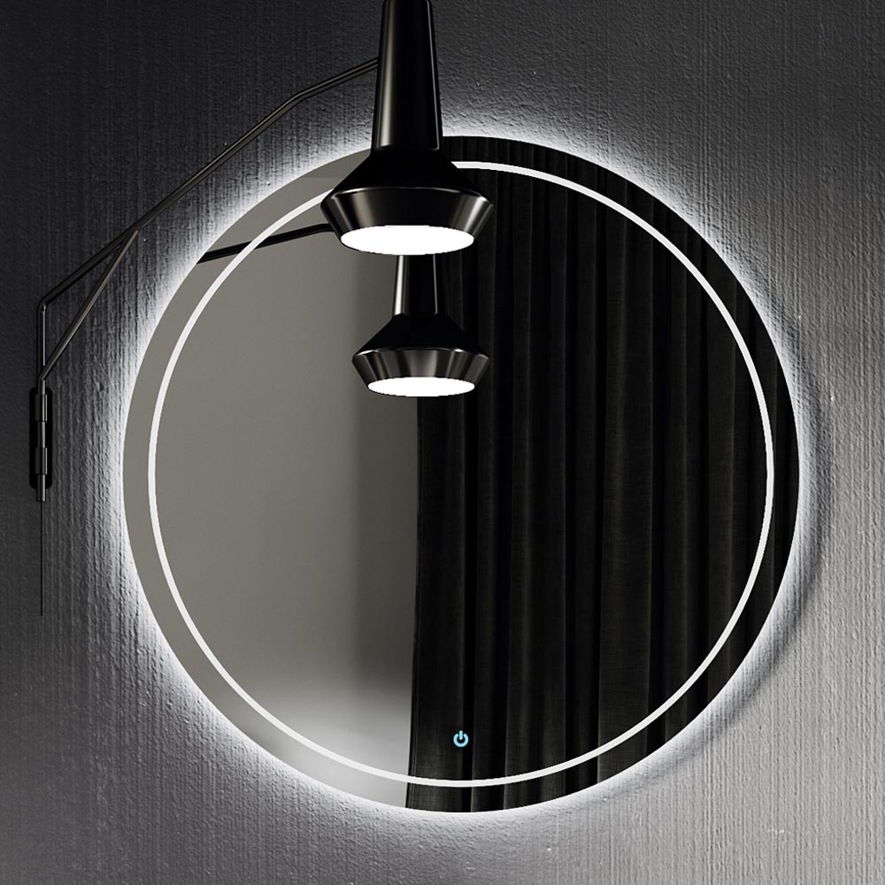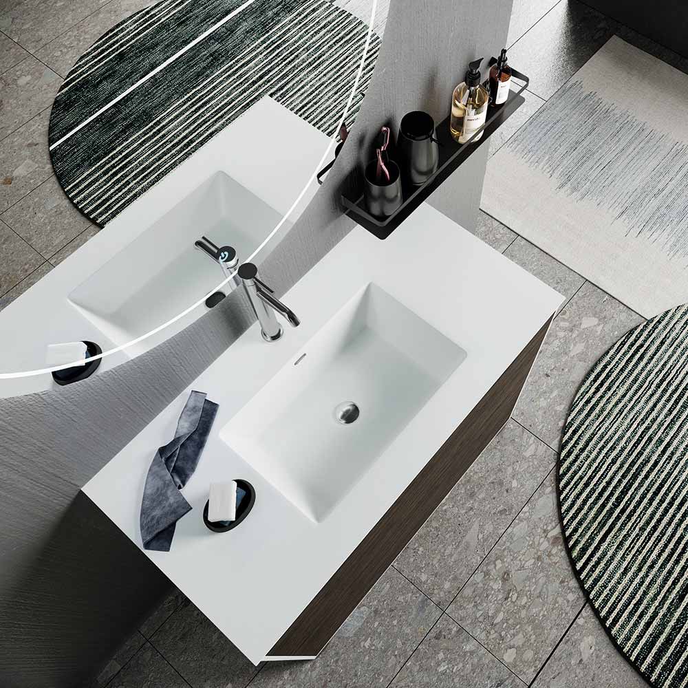 Bathroom composition complete with built-in resin washbasin , round glass mirror with touch front and perimeter LED and scratch-resistant melamine base with 3 fully extractable drawers and soft close closure in dark brown colour.