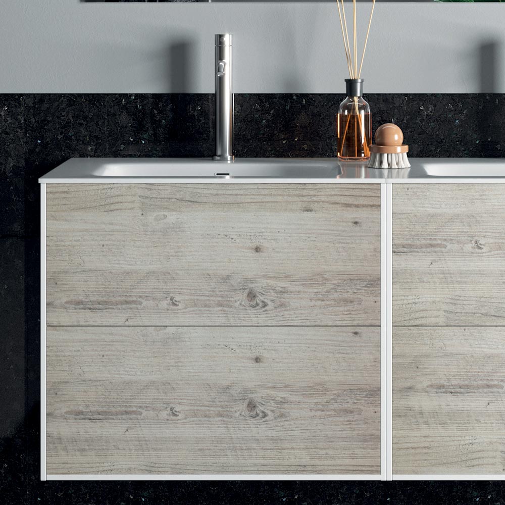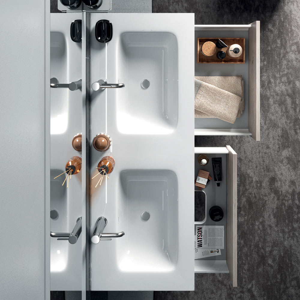 Bathroom composition complete with double ceramic sink , rectangular mirror with single front LED light Ā and base in arctic pine-coloured scratch-resistant melamine with 4 drawers with total opening and soft close closure.