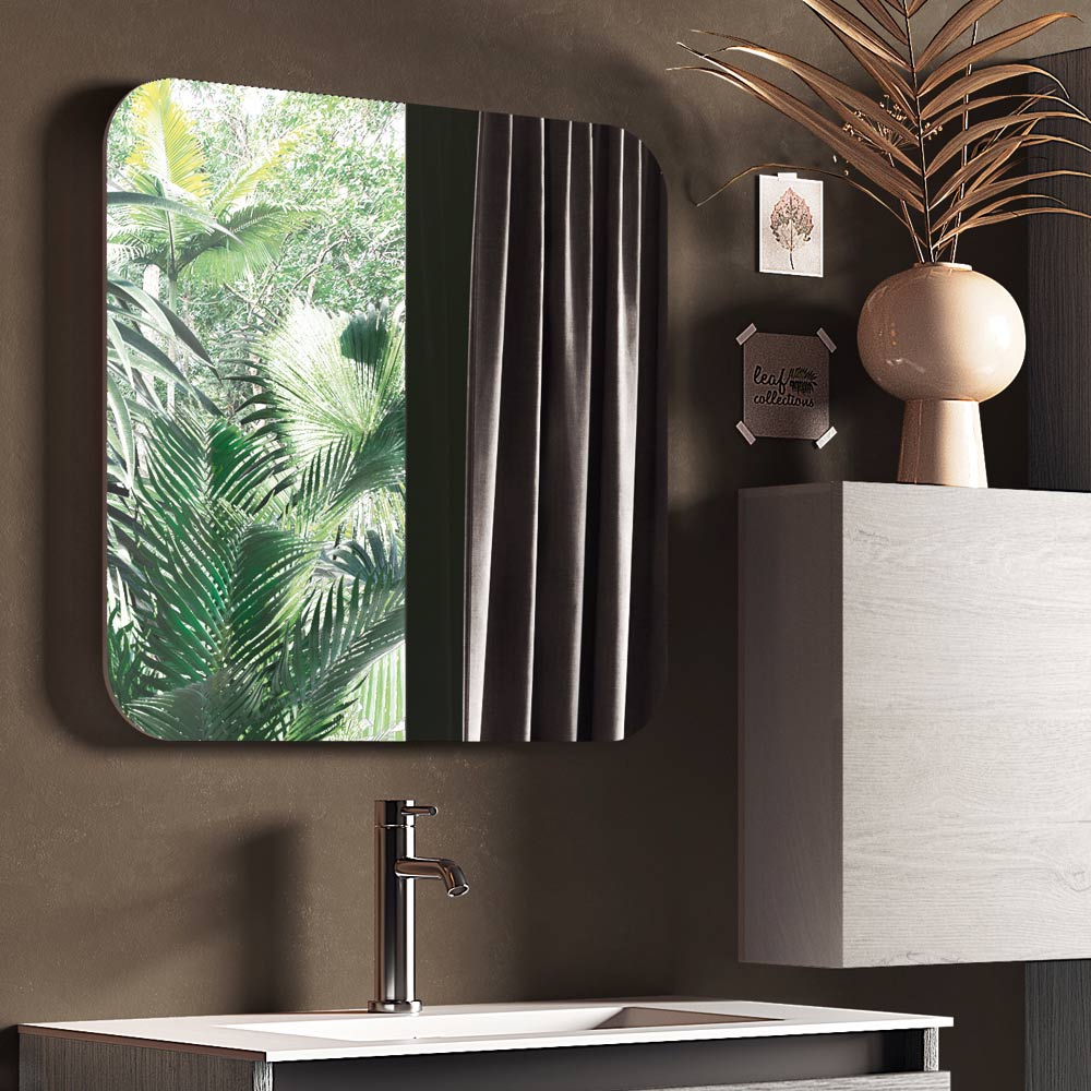 Bathroom composition with square mirror with rounded corners, base in scratch -resistant ash oak with fully extractable drawer and soft close closure and built-in sink in glossy white resin Made in Italy.