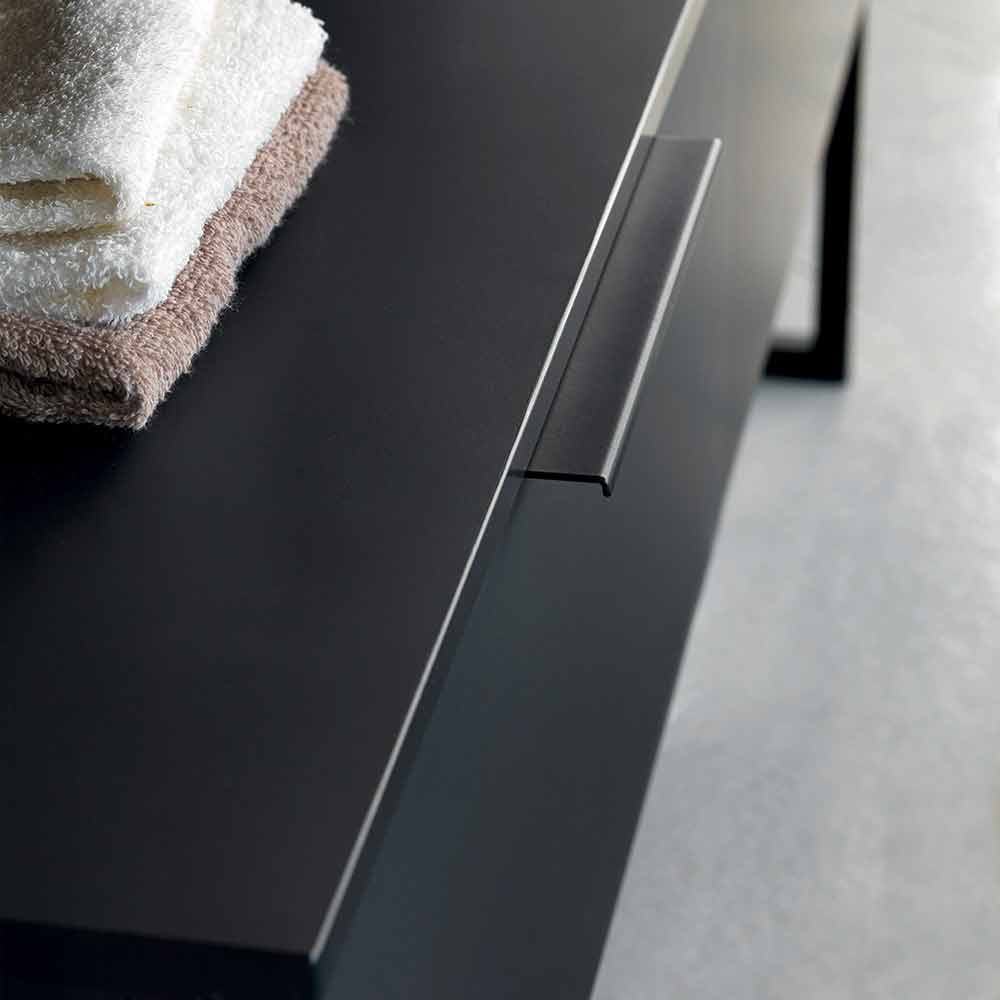 vanity unit includes two drawers in matt black fenix and is supported by support feet in matt black metal.