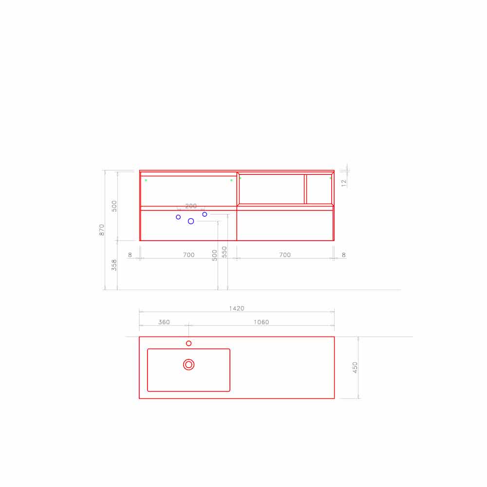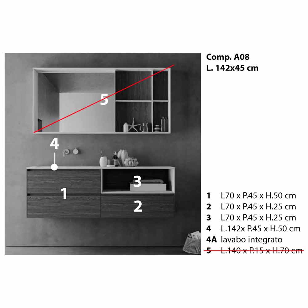 The furniture set is in tobacco oak unicolor HPL , integrated washbasin in matt white Novcryl , open compartment in matt white lacquer and back in tobacco oak unicolor HPL.