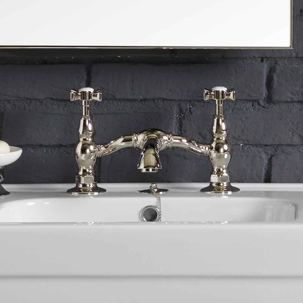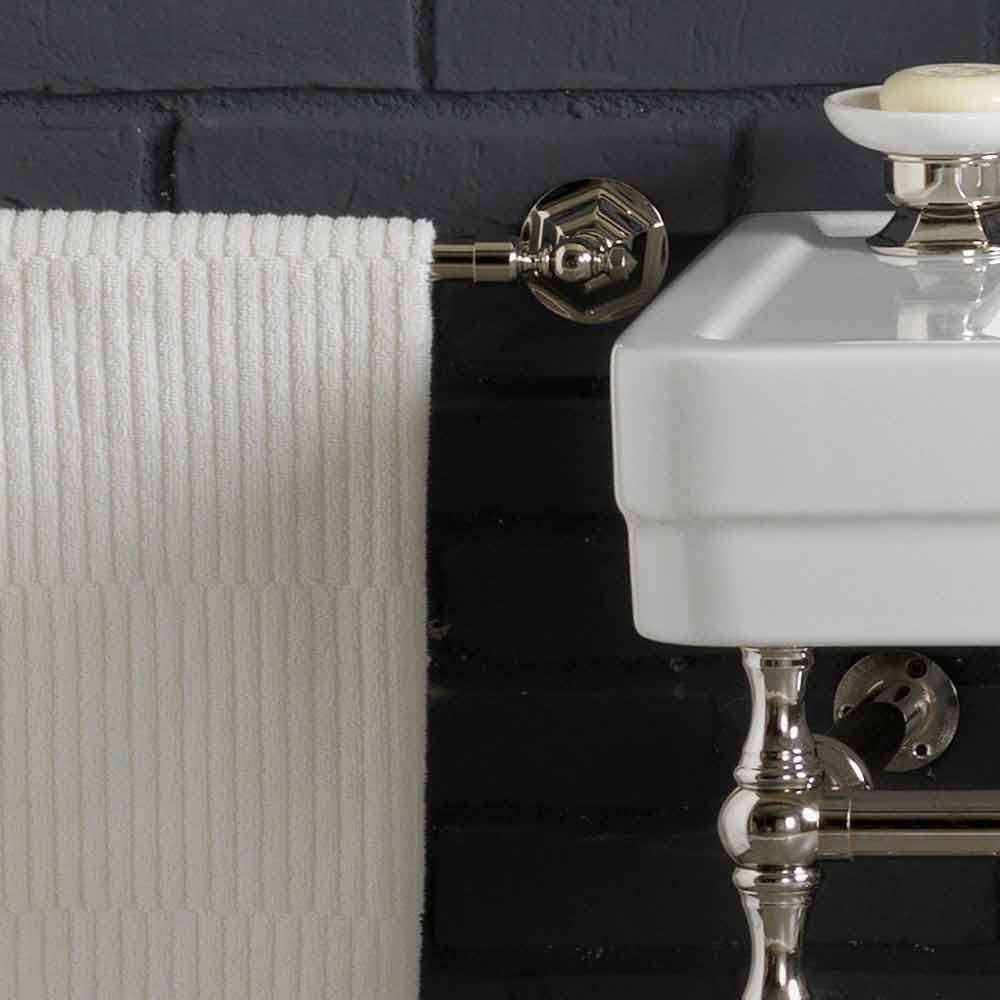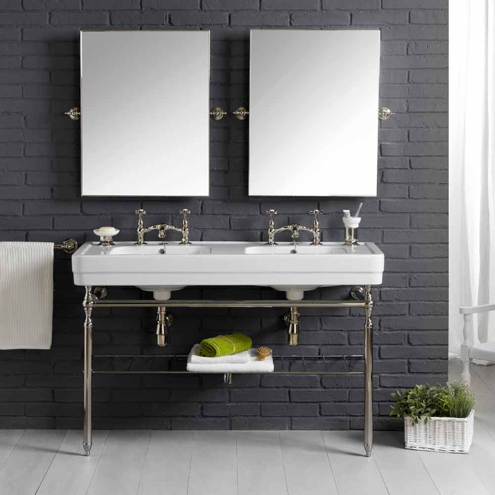 This beautiful composition includes an elegant and spacious double washbasin fixed to the wall and resting on a structure in the elegant polished nickel finish that creates delicate light points.