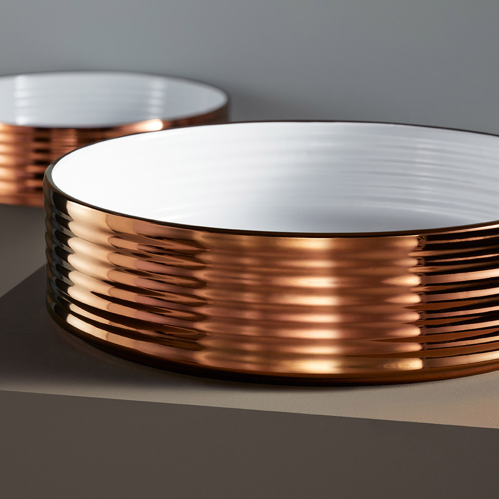 • Interior and exterior glossy white enamel, polished copper edge
