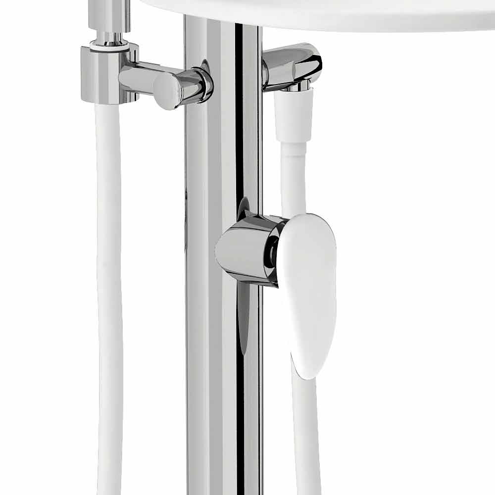 Deck mounted bath mixer with diverter, duplex hand shower and shelf in DuPont ⢠Corian® Made in Italy.