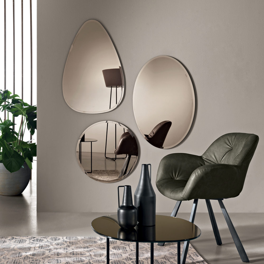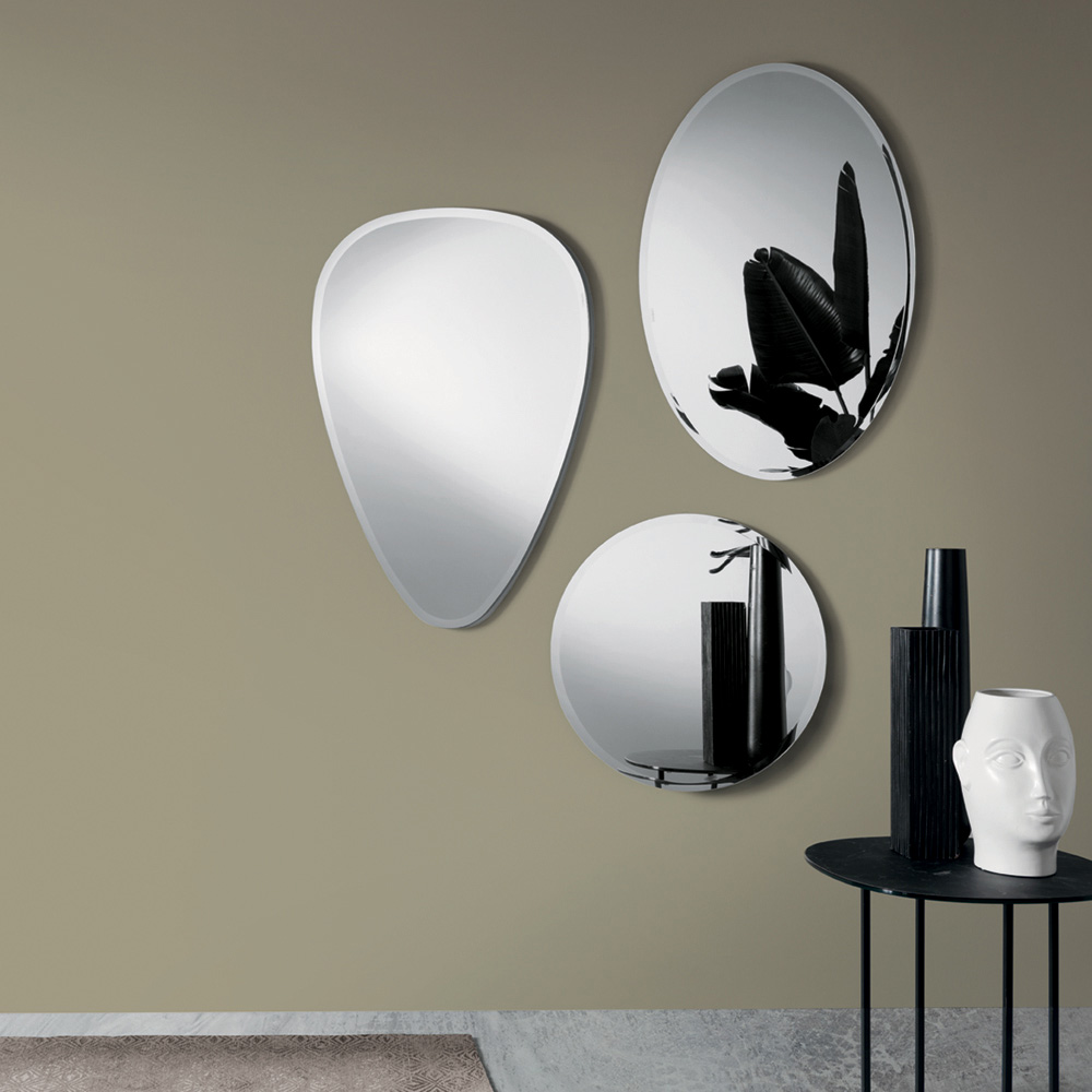 Each element is embellished with a beveled edge that enhances the mirror's silhouette and enhances its luminosity. The three shapes can be combined to create an elegant and contemporary composition, transforming the wall into a blend of reflections and decorative geometries.
