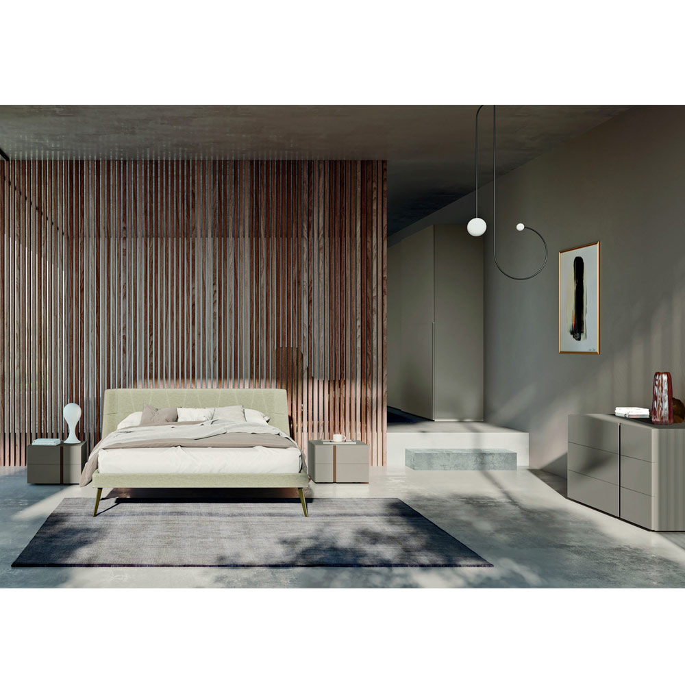 Complete bedroom furniture with 4 elements entirely made in Italy . The composition includes a double bed with wooden bed frame and headboard completely covered in fabric and burnished metal feet, two bedside tables with 2 drawers each and a 3-drawer chest of drawers in terracotta and matt terra lacquered wood with opening through a practical groove positioned on the drawer front. The peculiarity is represented by the unusual shape of the headboard that closes inwards recreating the feeling of a reassuring refuge and is also embellished by the refined design created through the seams on the top. Together with the bedside tables and the dresser, the atmosphere created has an elegant and formal character played down by the fresh color nuances chosen for the fabric. The result is a composition for the night environment capable of completing any space with a modern style in an exclusive and refined way.