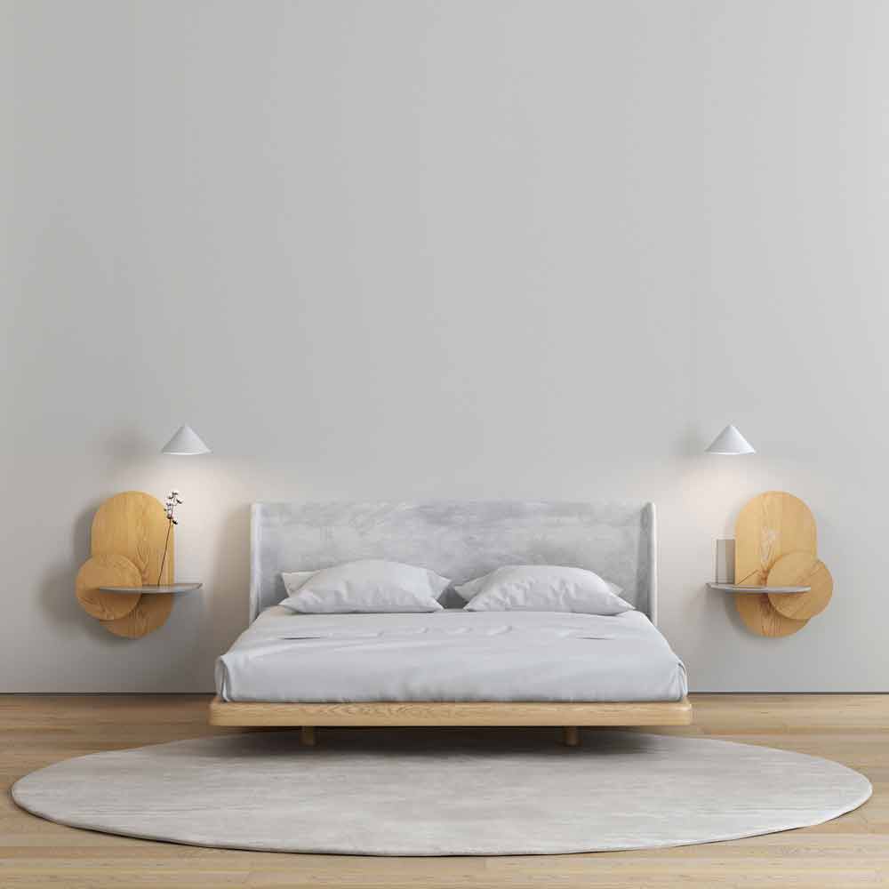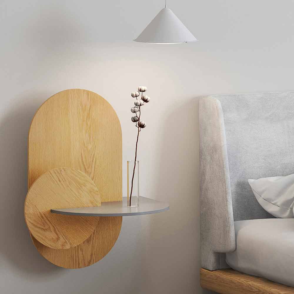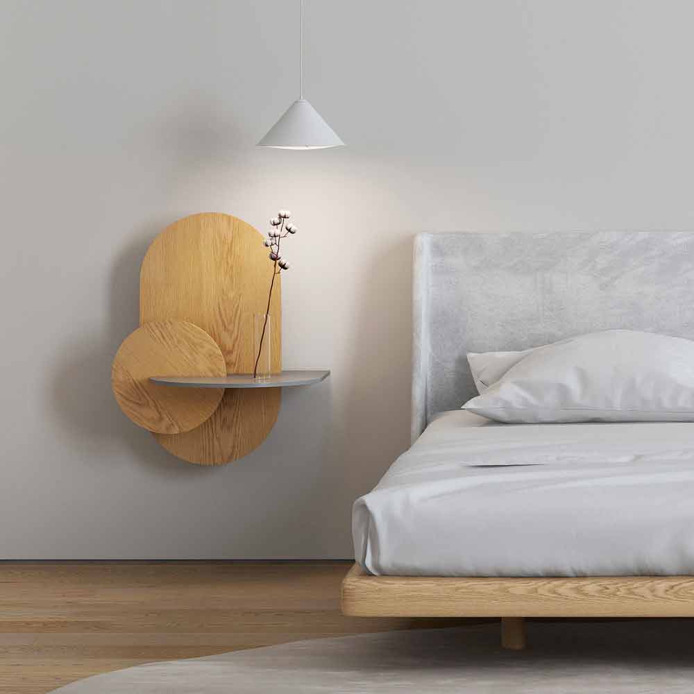 This modular bedside table is made up of 3 plywood panels, 2 of which in oak finish and one in gray-stained ash finish . The panel that acts as a real support surface is fixed to the wall thus allowing no type of base that can occupy more space, while the two vertically positioned panels are modular and allow up to 8 different configurations thus obtaining a customizable product according to your needs.